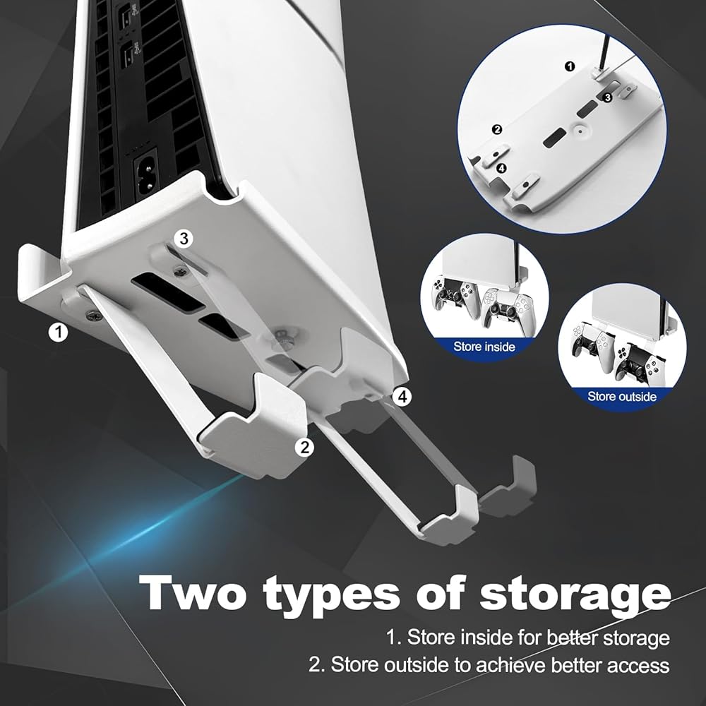 التخزين المنظم: توفر الفتحات الأربع الموجودة أسفل لوحة التثبيت لدعائم تعليق قابلة للفصل ومريحة لتخزين وحدتي التحكم اللاسلكيتين PS5 (DualSense وDualSense Edge) أو سماعة الألعاب الخاصة بك. مجموعة من قطعة واحدة تجعلها الملحقات التي لا غنى عنها لمجموعة PS5