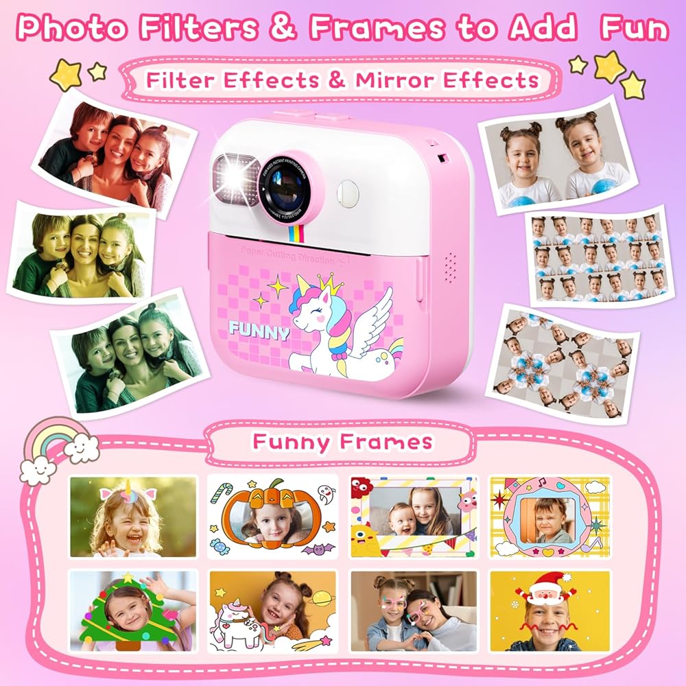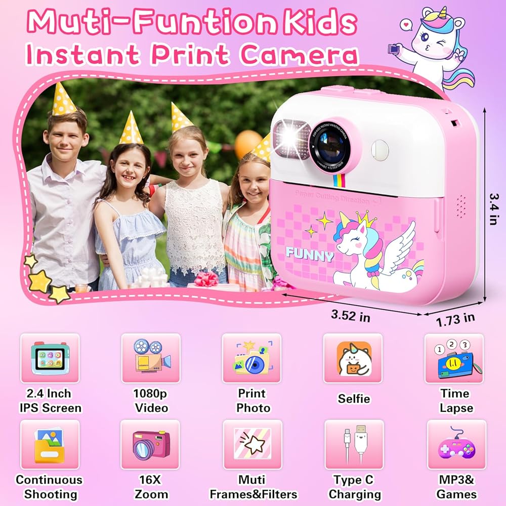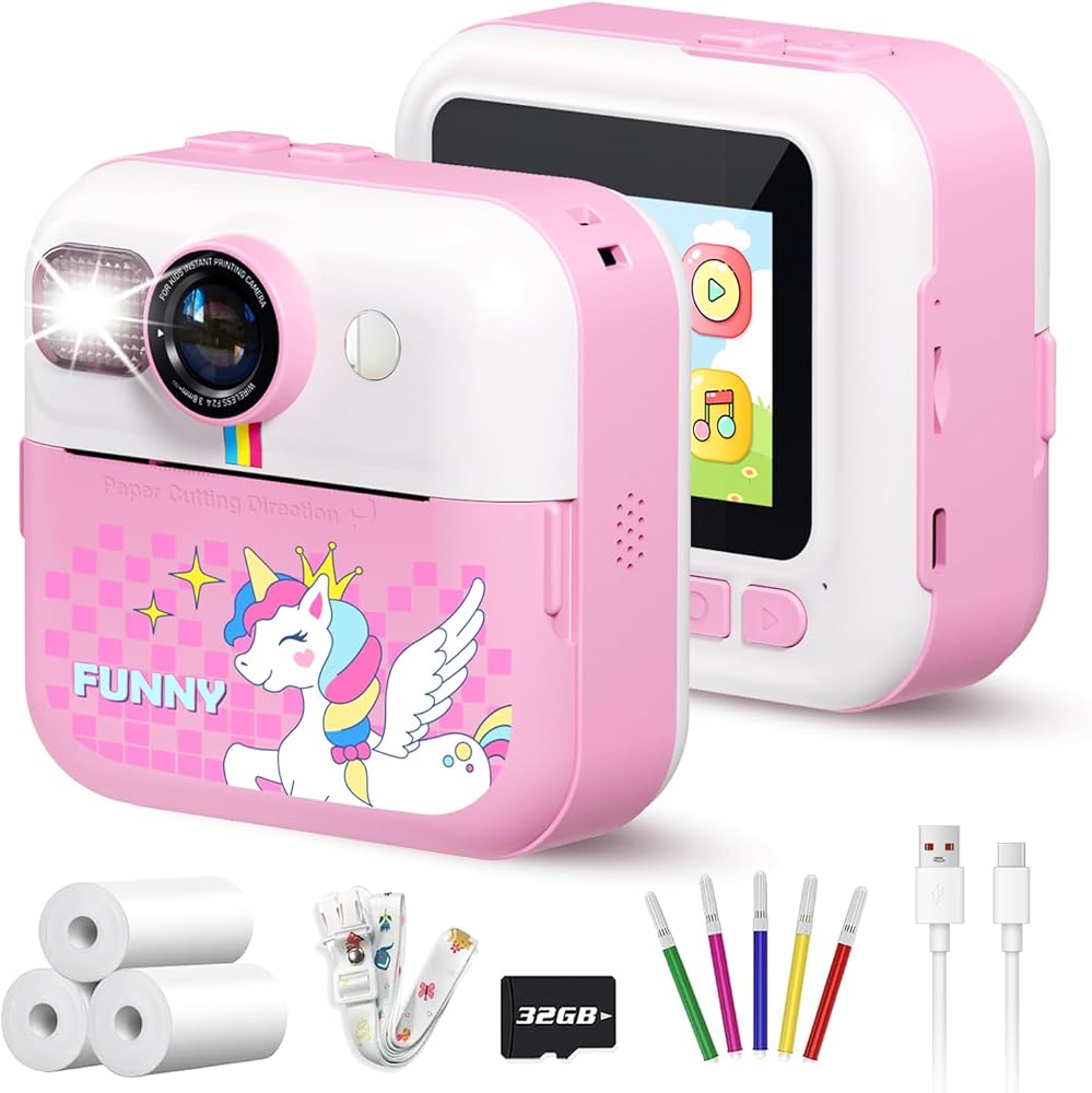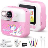 طباعة فورية لكاميرا الأطفال، كاميرا فورية بشاشة 2.4 بوصة للأطفال، مقاطع فيديو بدقة 1080 بكسل وكاميرا رقمية للأطفال Selife مع بطاقة 32 جيجابايت وورق طباعة، هدايا عيد الميلاد وكاميرا Unicon للأطفال من سن 3 إلى 12 عامًا