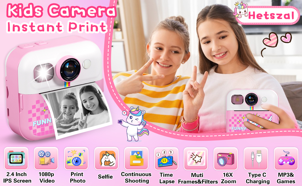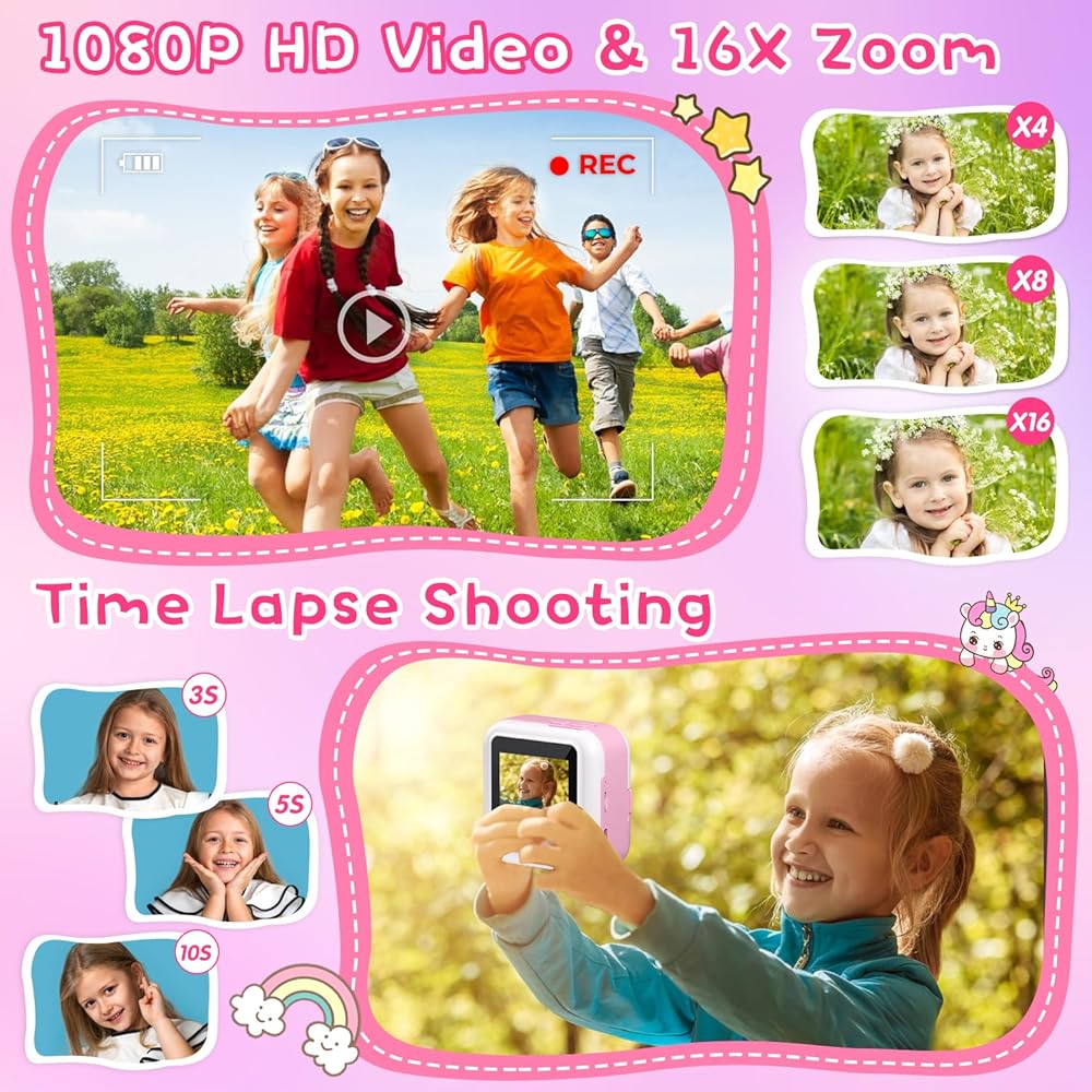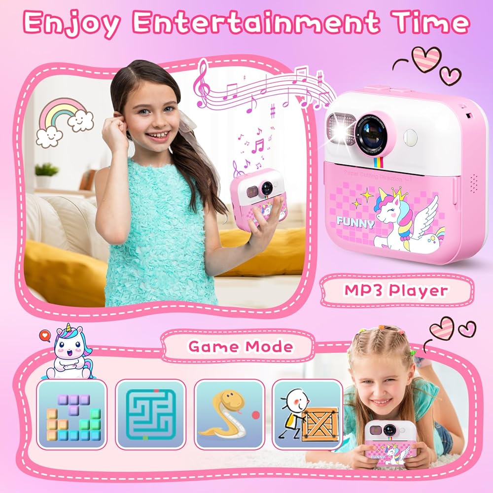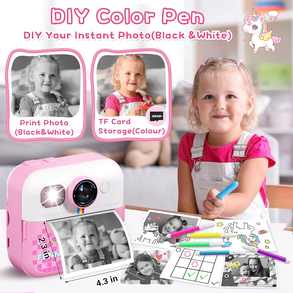 طباعة فورية لكاميرا الأطفال، كاميرا فورية بشاشة 2.4 بوصة للأطفال، مقاطع فيديو بدقة 1080 بكسل وكاميرا رقمية للأطفال Selife مع بطاقة 32 جيجابايت وورق طباعة، هدايا عيد الميلاد وكاميرا Unicon للأطفال من سن 3 إلى 12 عامًا