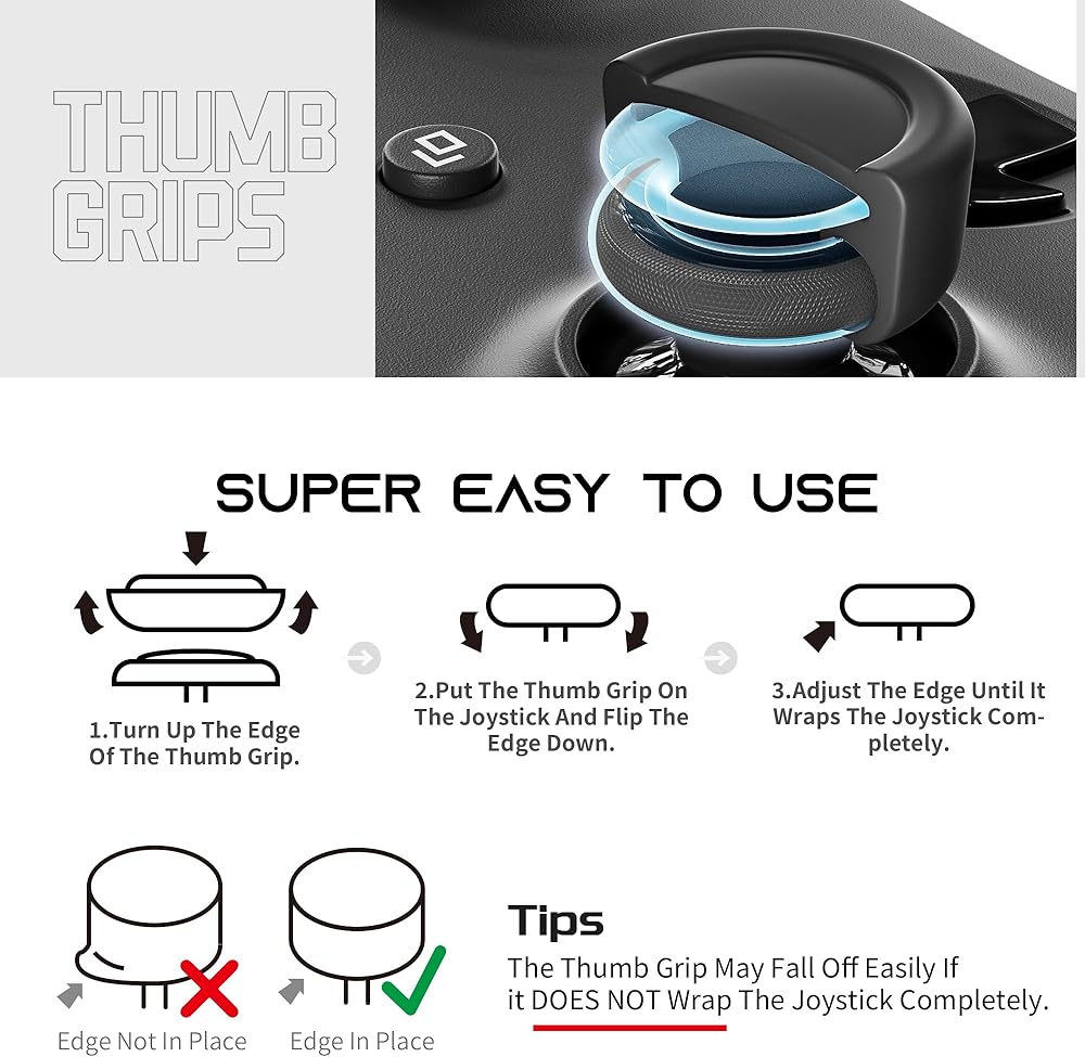 • 【Easy to install】Just take a few steps to install the thumbstick caps on the controller.Step 1Turn up the edge of the grip.Step 2.Press down the grip on the thumbstick.Step 3.Adjust the edge of the grip while rotating the thumbstick covers onto the joystick until it is fully covered completely.