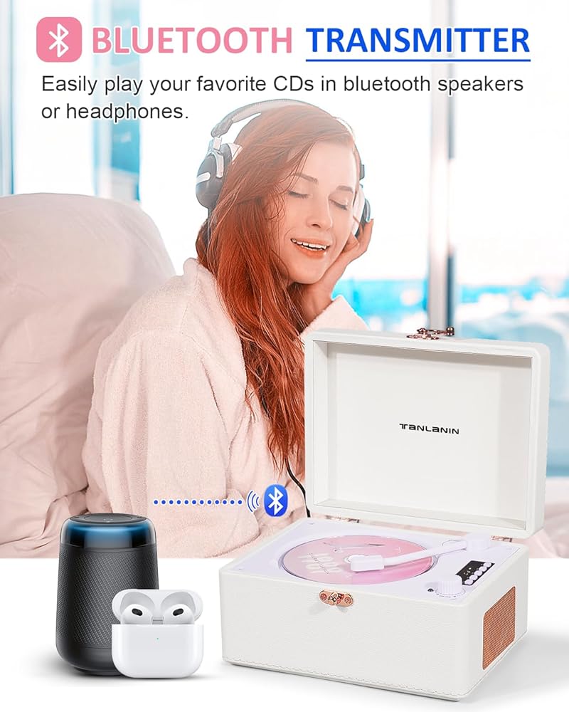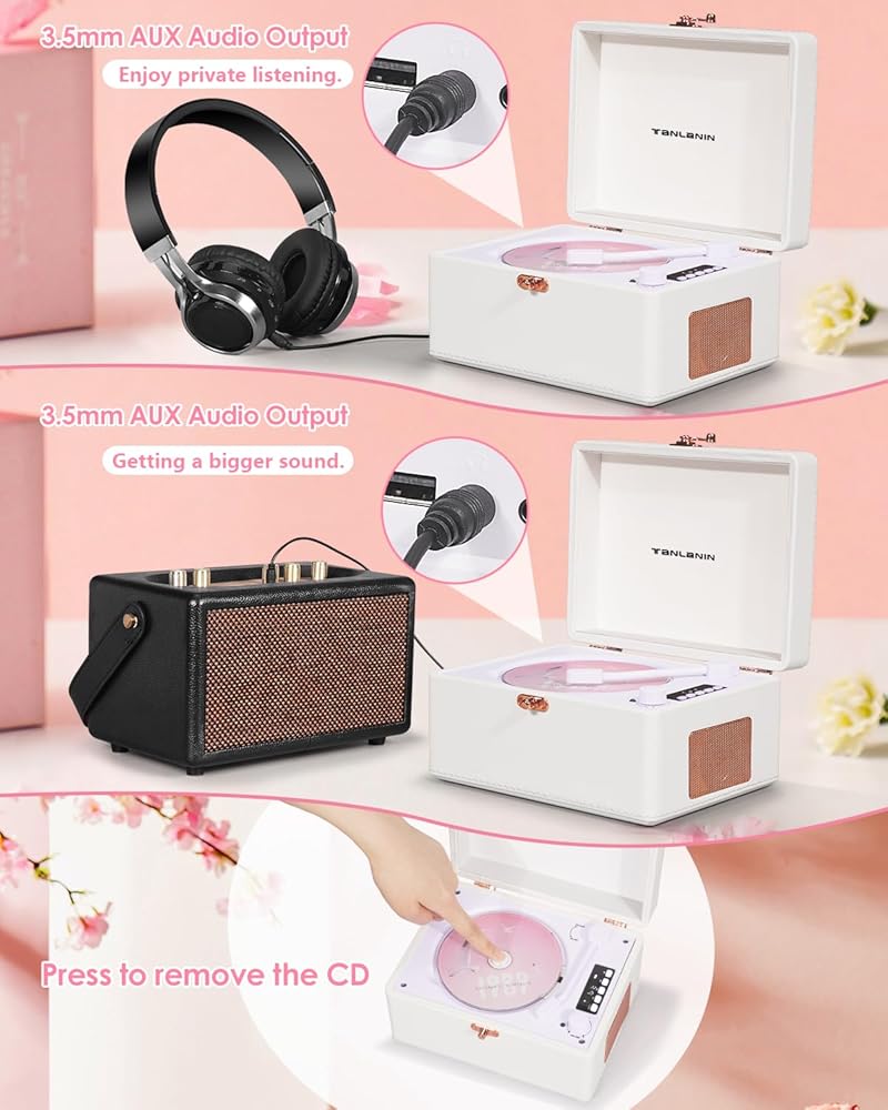 【أوضاع صوت متعددة】- لا يمكنها تشغيل الأقراص المضغوطة فحسب، بل تدعم أيضًا إدخال الصوت عبر البلوتوث/USB/AUX. يتيح لك مقبس سماعة الرأس توصيل سماعات الرأس للاستماع الخاص، ويمكنك أيضًا إخراج قرص صوتي مضغوط إلى مكبرات صوت أخرى للحصول على صوت أفضل. تقوم وظيفة إخراج البلوتوث بنقل الصوت إلى سماعة رأس بخاصية البلوتوث أو مكبر صوت بخاصية البلوتوث.