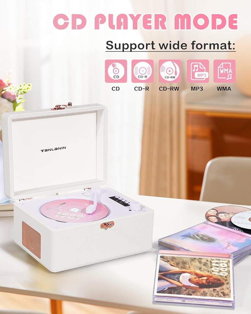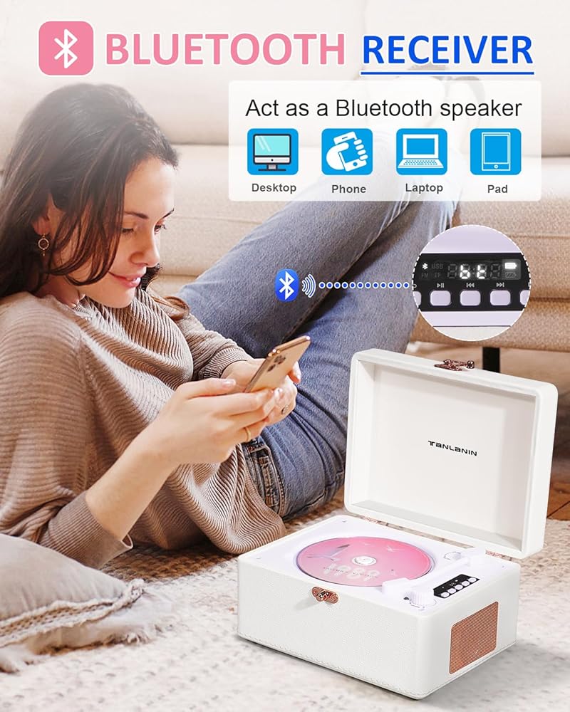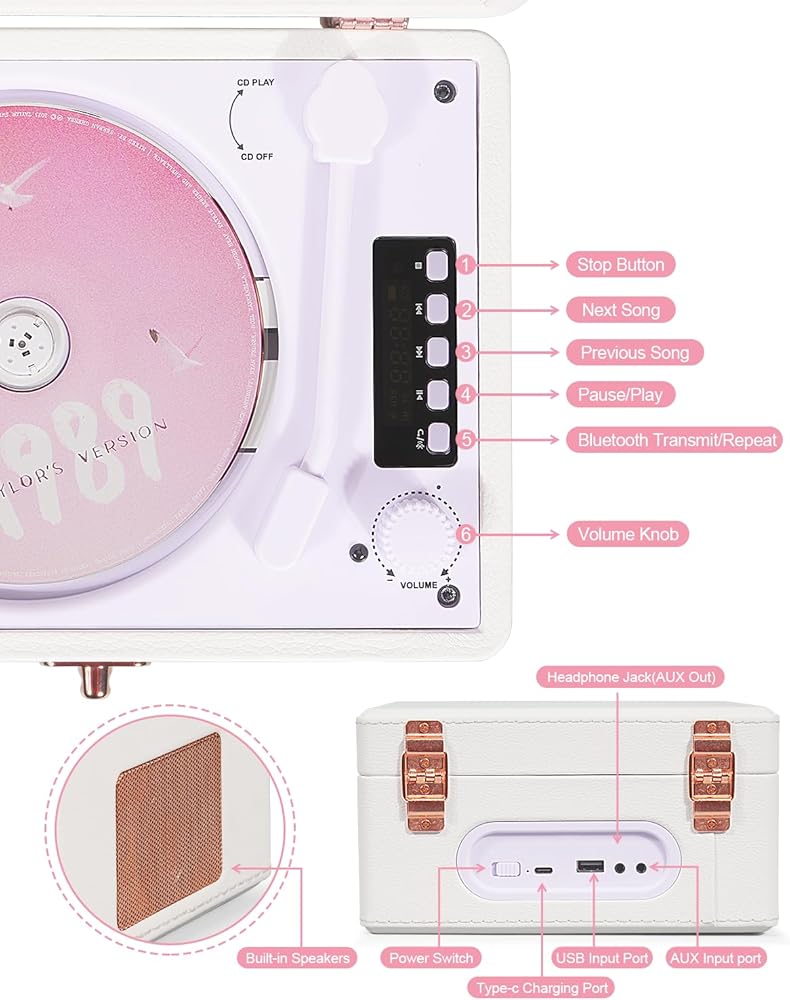 【مظهر محسّن】- مشغل الأقراص المضغوطة هذا مزين بجلد ليتشي من البولي يوريثان باللون الأبيض النقي، ويكمله بشكل مثالي أجزاء صلبة من الذهب الوردي. استرخ بعد يوم حافل بالاستماع إلى الموسيقى المفضلة لديك وأضف لمسة من الرقي إلى مساحة الاستماع الخاصة بك.