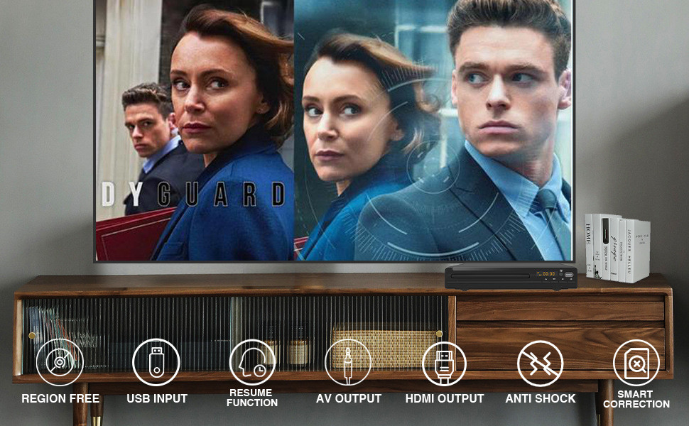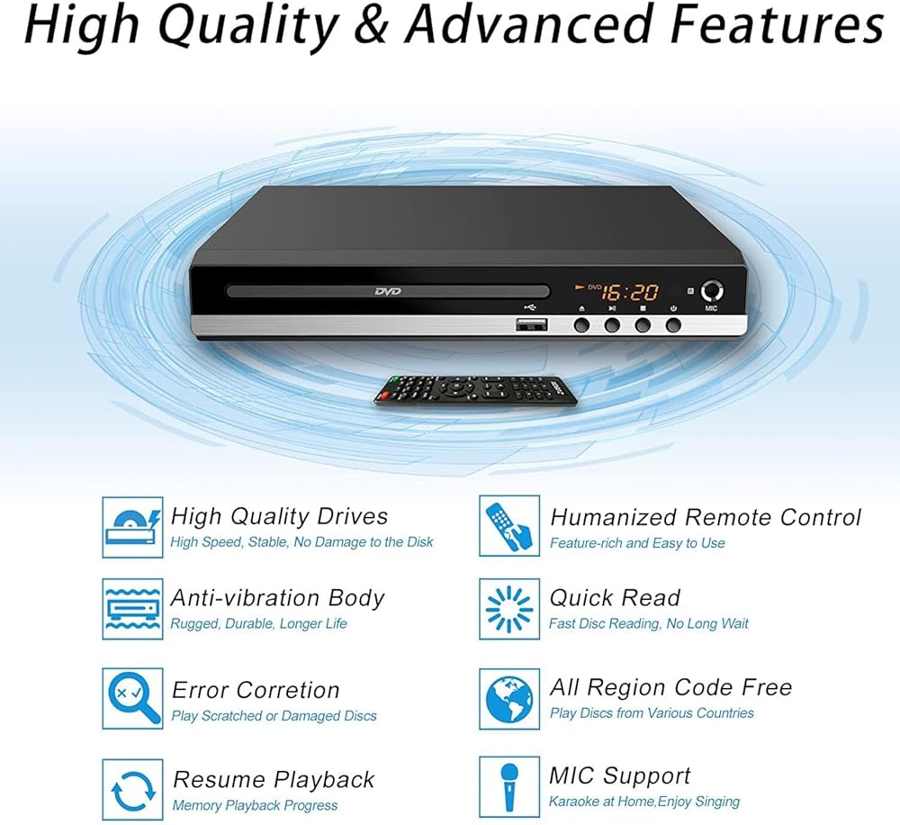 مشغل أقراص مضغوطة HD 1080P: حجم صغير 8.7*7.6*1.7 بوصة، جودة صورة عالية الدقة 1080P. تمنحك سرعة قراءة القرص السريعة وشريحة فك التشفير القوية تجربة مشاهدة مثالية.