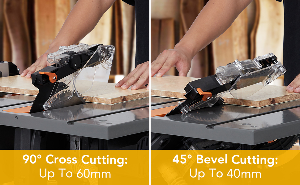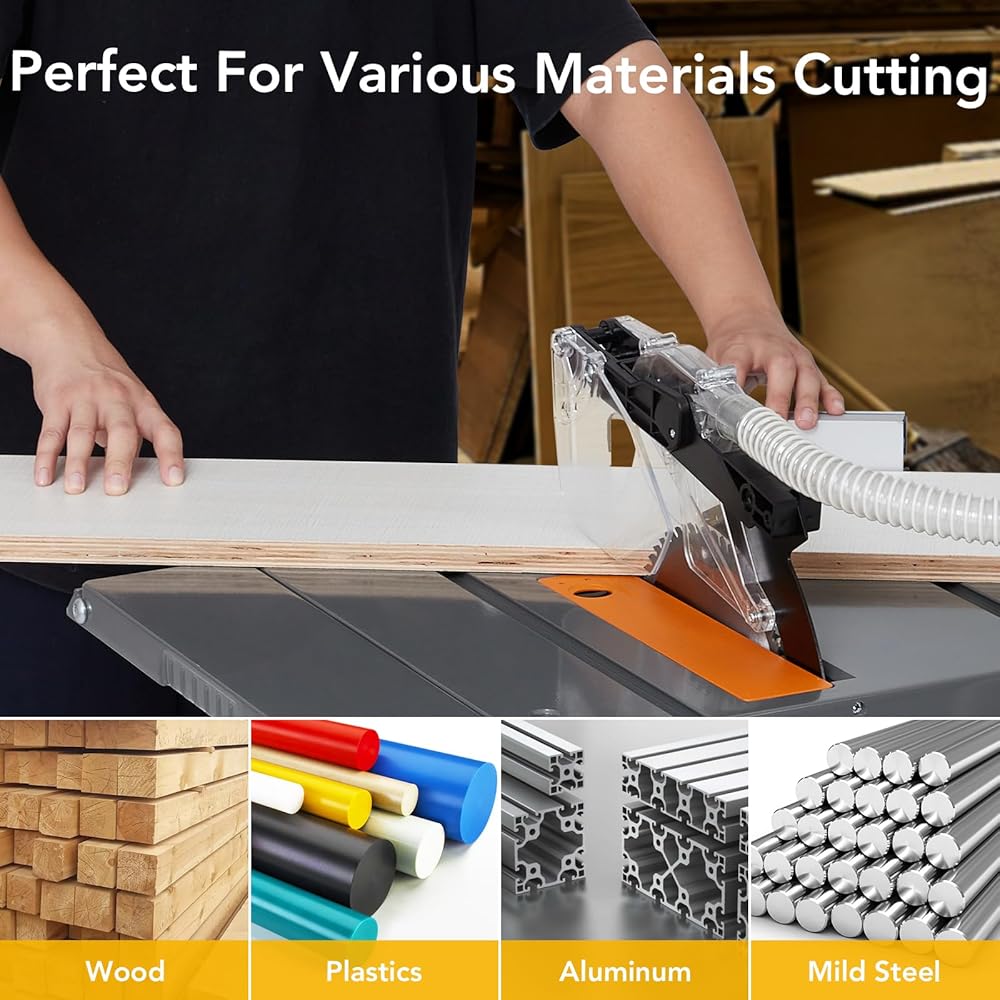 السلامة أولاً: سلامتك تهمنا دائمًا. تم تصميم منشار طاولة موقع العمل هذا مع واقي أمان يمنع نشارة الخشب من التطاير في الهواء. يمنع واقي الشفرة أيضًا شفرة المنشار من الظهور في حالة كسرها. إذا كانت الماكينة محملة بشكل زائد، فإنها تتوقف تلقائيًا، مما يحمي سلامتك بينما يطيل عمر منشار الطاولة.