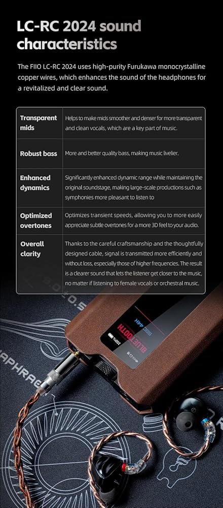 خصائص الصوت: تستخدم سماعة FiiO LC-RC 2024 أسلاك نحاس فوروكاوا أحادية البلورية عالية النقاء، مما يعزز صوت السماعات للحصول على صوت متجدد وواضح.