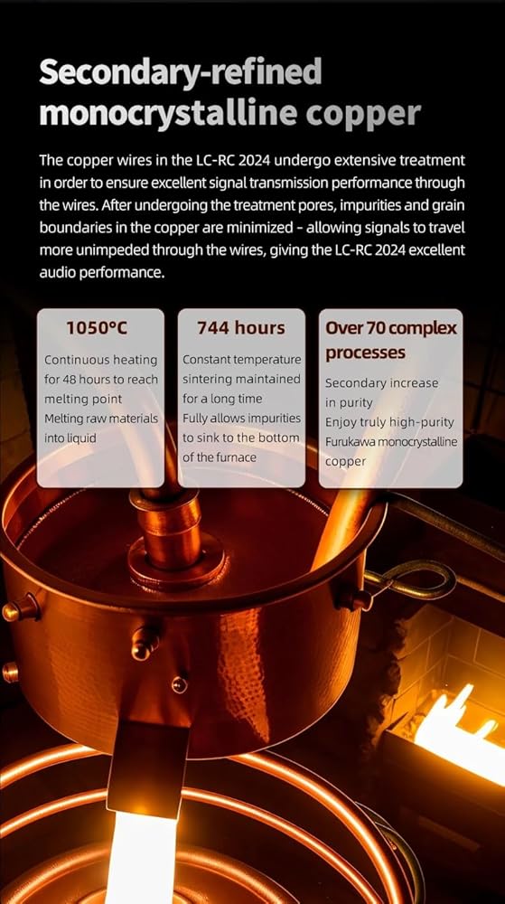 النحاس الأحادي البلوري المكرر بشكل ثانوي: بعد خضوعه لمسام المعالجة، يتم تقليل الشوائب وحدود الحبوب في النحاس إلى الحد الأدنى - مما يسمح للإشارات بالانتقال دون عوائق عبر الأسلاك، مما يمنح LC-RC 2024 أداءً صوتيًا ممتازًا.