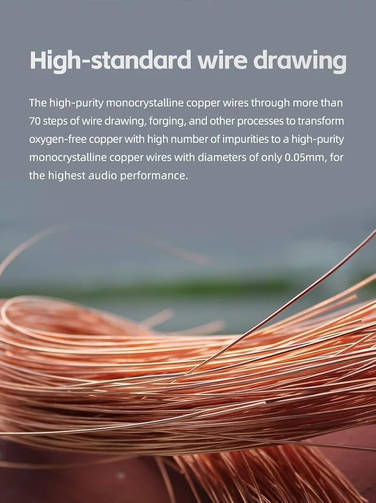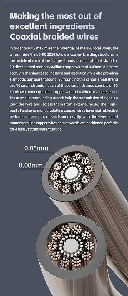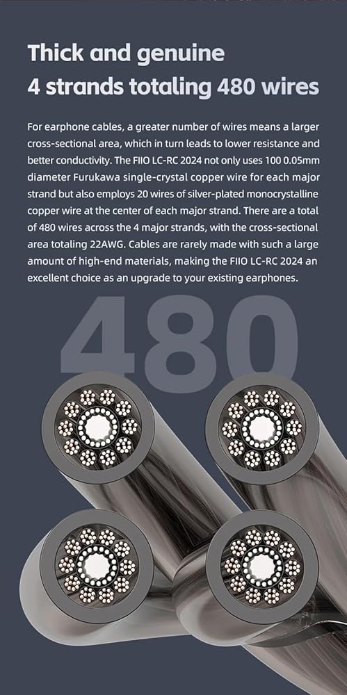 480 سلكًا مع أسلاك مضفرة متحدة المحور: تتميز أسلاك فوروكاوا النحاسية أحادية البلورية عالية النقاء بأداء موضوعي عالٍ وتوفر جودة صوت ثابتة، بينما تضمن الأسلاك النحاسية أحادية البلورية المطلية بالفضة وضع الأغاني بشكل مثالي للحصول على صوت غني وشفاف.