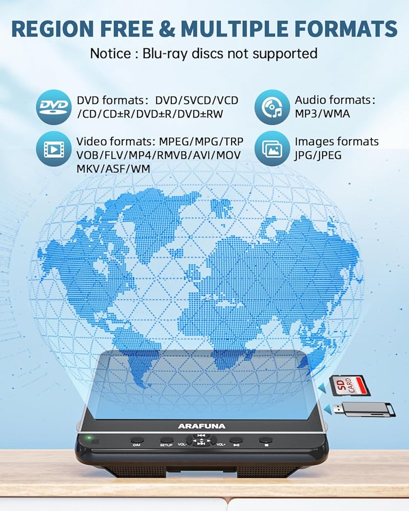 • 【آخر ذاكرة وأشكال متعددة】مشغل DVD المزدوج الخاص بنا لتشغيل جميع أقراص المناطق مباشرة من CD وDVD وCD-R/RW وDVD-R/+R وDVD+RW/-RW وVCD إلى SVCD (ولكن ليس أزرق) -راي دي في دي). دعم بطاقة USB/SD (بحد أقصى 128 جيجابايت FAT32 و1920*1080 بكسل). متوافق مع MPEG/ MPG/ TS/ TRP/ VOB/ FLV/ RMVB/ MP4/ AVI/ MOV/ MKV/ ASF/ WMV. يمكن أن تبدأ وظيفة الذاكرة الأخيرة من حيث توقفت.