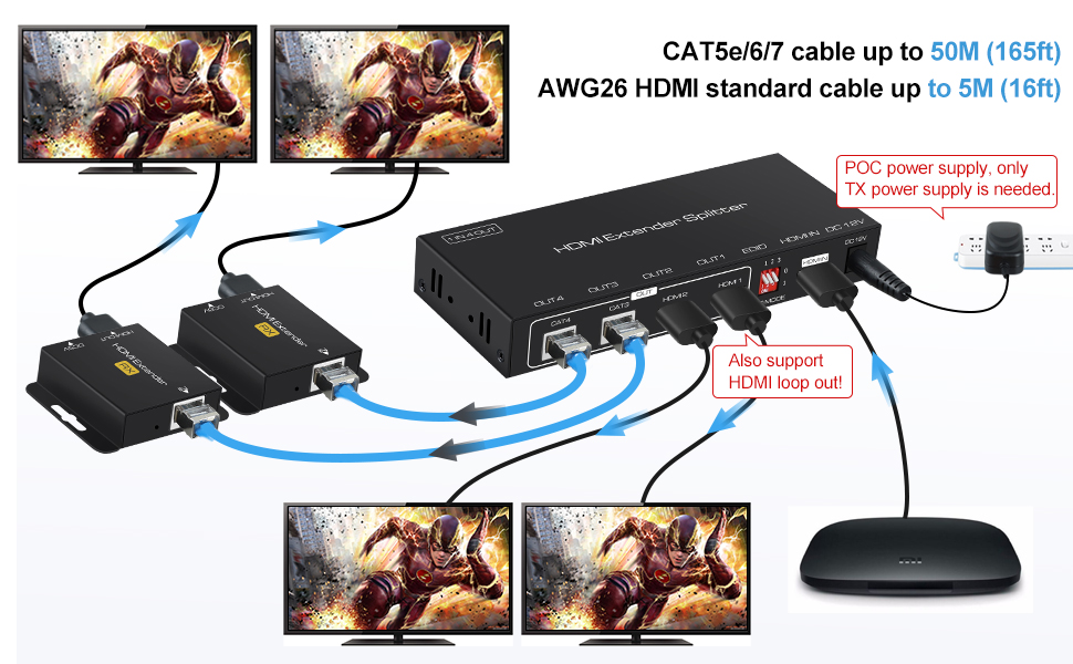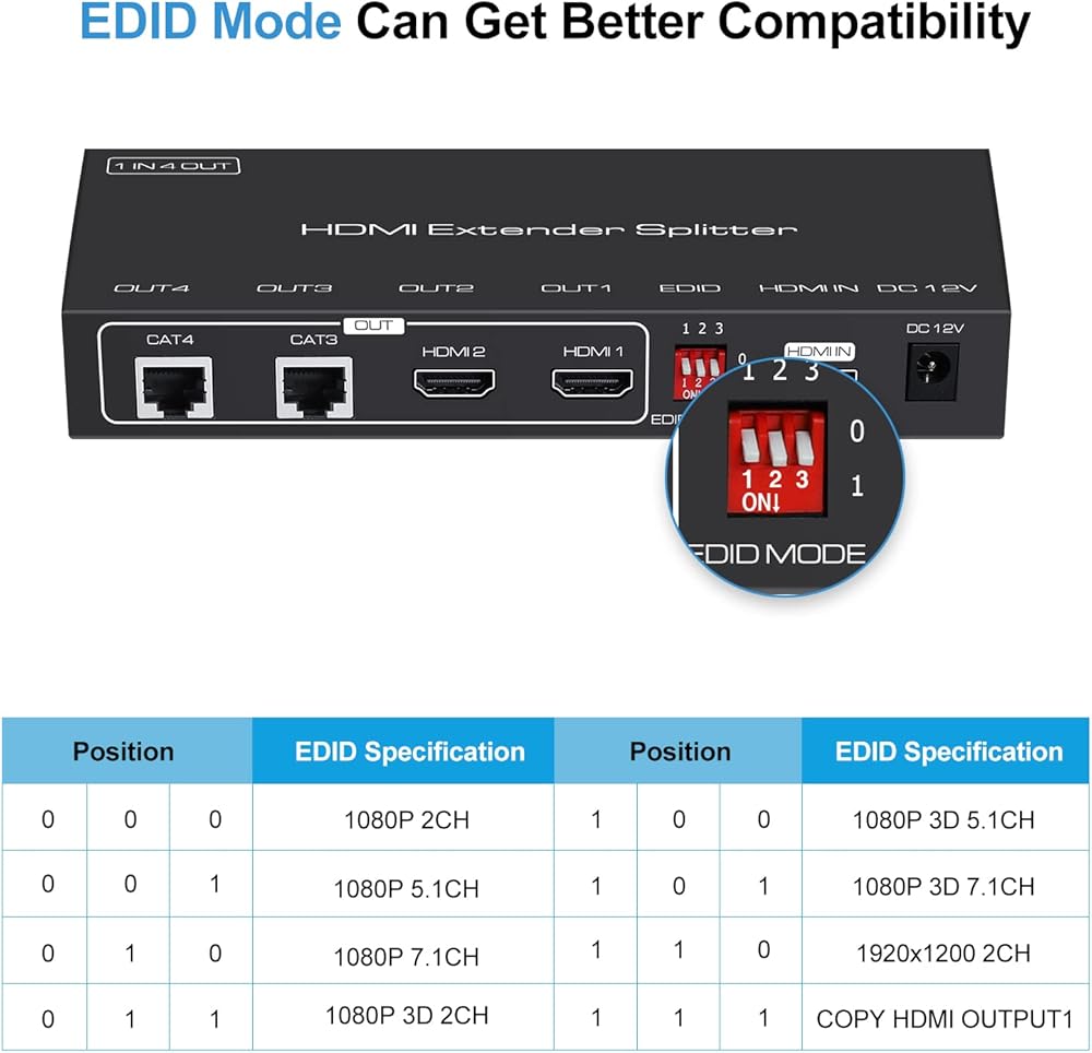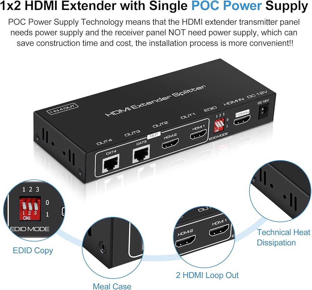 ❗❗مصدر طاقة POC: يعتمد موسع HDMI 1080p تقنية POC، والتي يمكنها تشغيل الكابل، لذلك تحتاج فقط إلى الطاقة إلى محطة TX. يمكن لمحول طاقة واحد أن يدعم تشغيل الجهاز بالكامل، مما يوفر الوقت والتكلفة، ويجعل عملية التثبيت أكثر راحة! يمكن لوظيفة EDID أن تقوم بإشارة تعريف تلقائية ومضمنة في ثمانية خيارات EDID، مما يعزز التوافق.