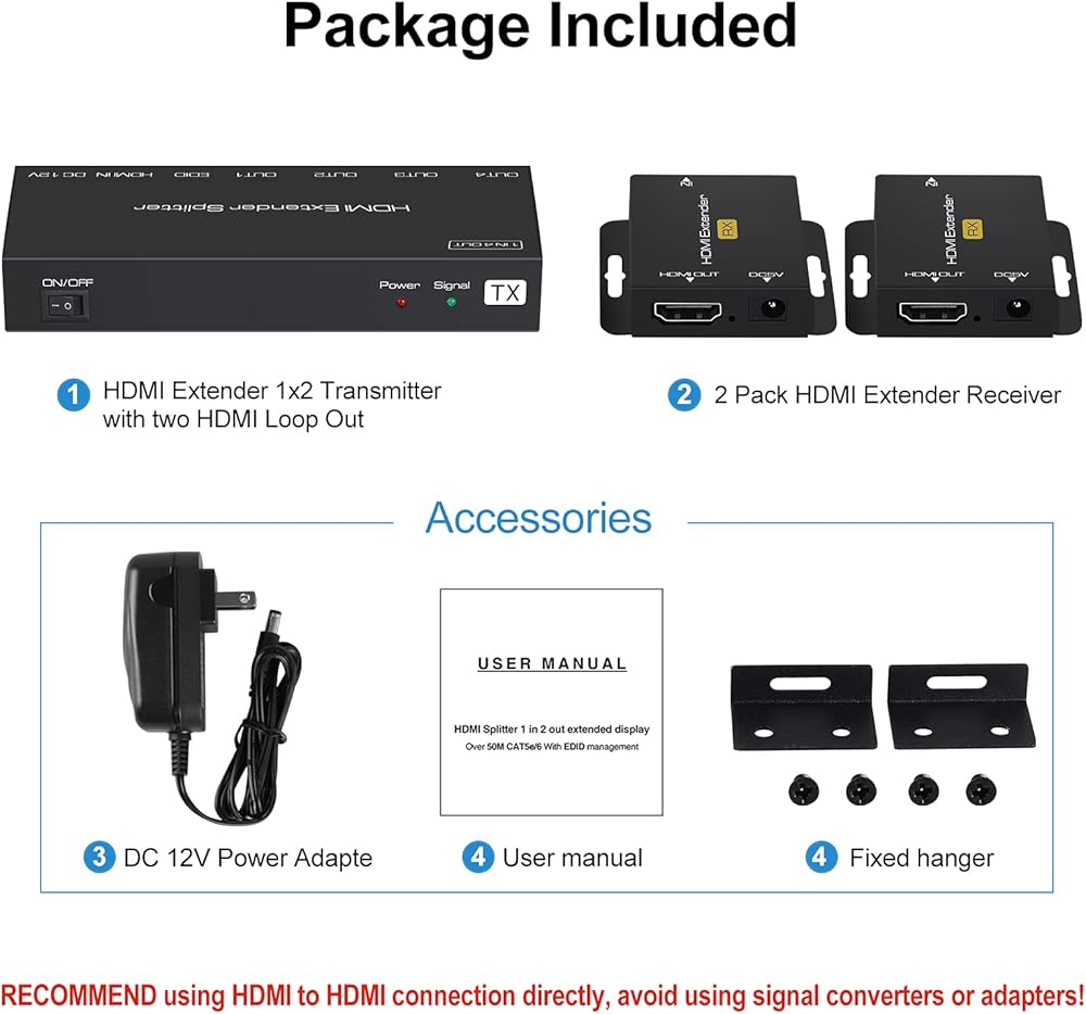 ❗❗ التوافق على نطاق واسع: موسع HDMI بطول 165 قدمًا لا يتطلب محركًا، فقط قم بالتوصيل والتشغيل، يمكنه توفير صوت فيديو سلس وواضح. متوافق مع معظم الأجهزة: TV Box، والكمبيوتر المحمول، والكمبيوتر الشخصي، ومشغل Blu-ray، وDVD، وRoku، والكمبيوتر المحمول وما إلى ذلك. إنه خيار مثالي للتعليم ومؤتمرات الفيديو والمشروع والمعارض وما إلى ذلك. ❗❗العبوة: 1 × 165 قدم (50 متر) جهاز إرسال HDMI 1X2 مع حلقتين HDMI؛ 2 * جهاز استقبال موسع HDMI؛ 1 * محول طاقة تيار مستمر 12 فولت؛ 1 * دليل المستخدم؛ 2 * شماعة ثابتة.