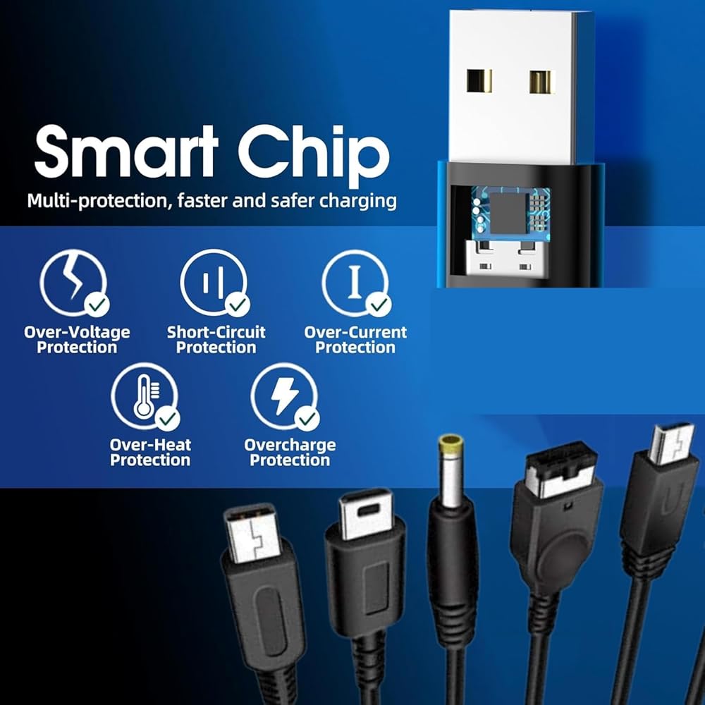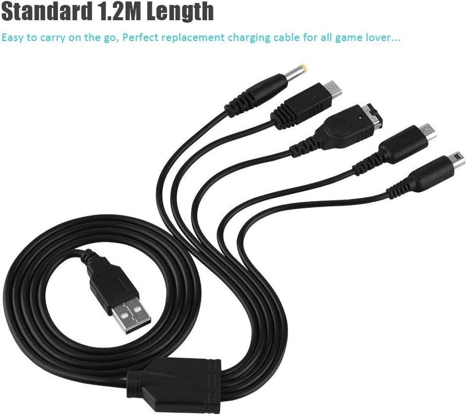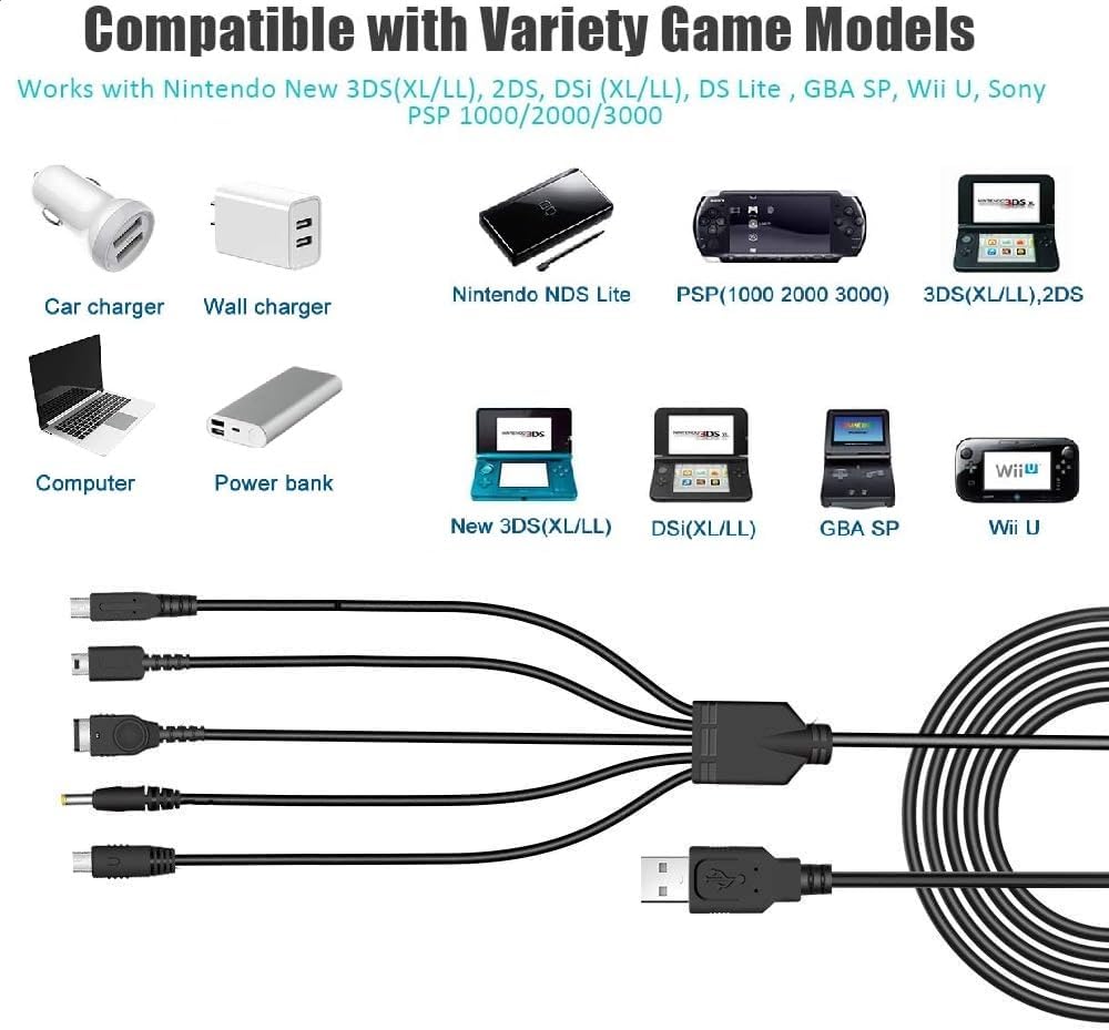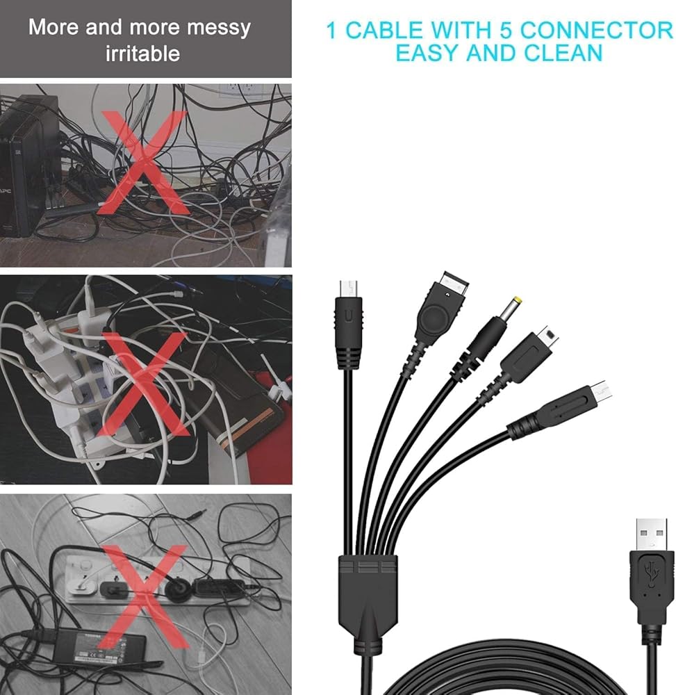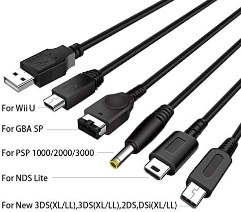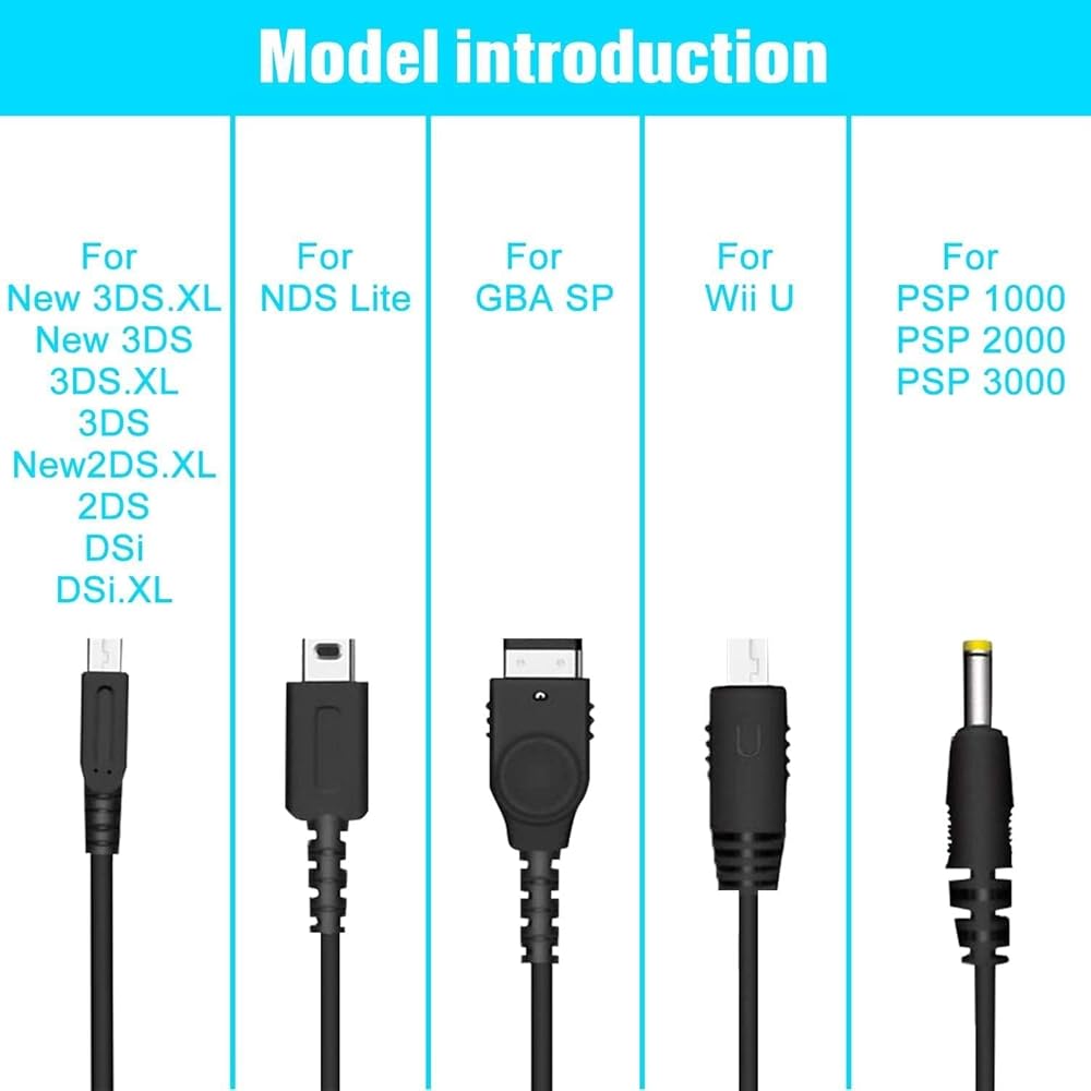 🕹️شاحن USB DS 5 في 1 - كابل شاحن USB واحد مع 5 موصلات مختلفة، متوافق مع Nintendo NDS Lite، New 3DS (XL/LL)، 3DS (XL/LL)، 2DS، DSi (XL/LL) ، NDS/GBA SP (gameboy Advance sp)، Wii U، PSP 1000 2000 3000. كابل شحن احترافي واحد يلبي الجميع