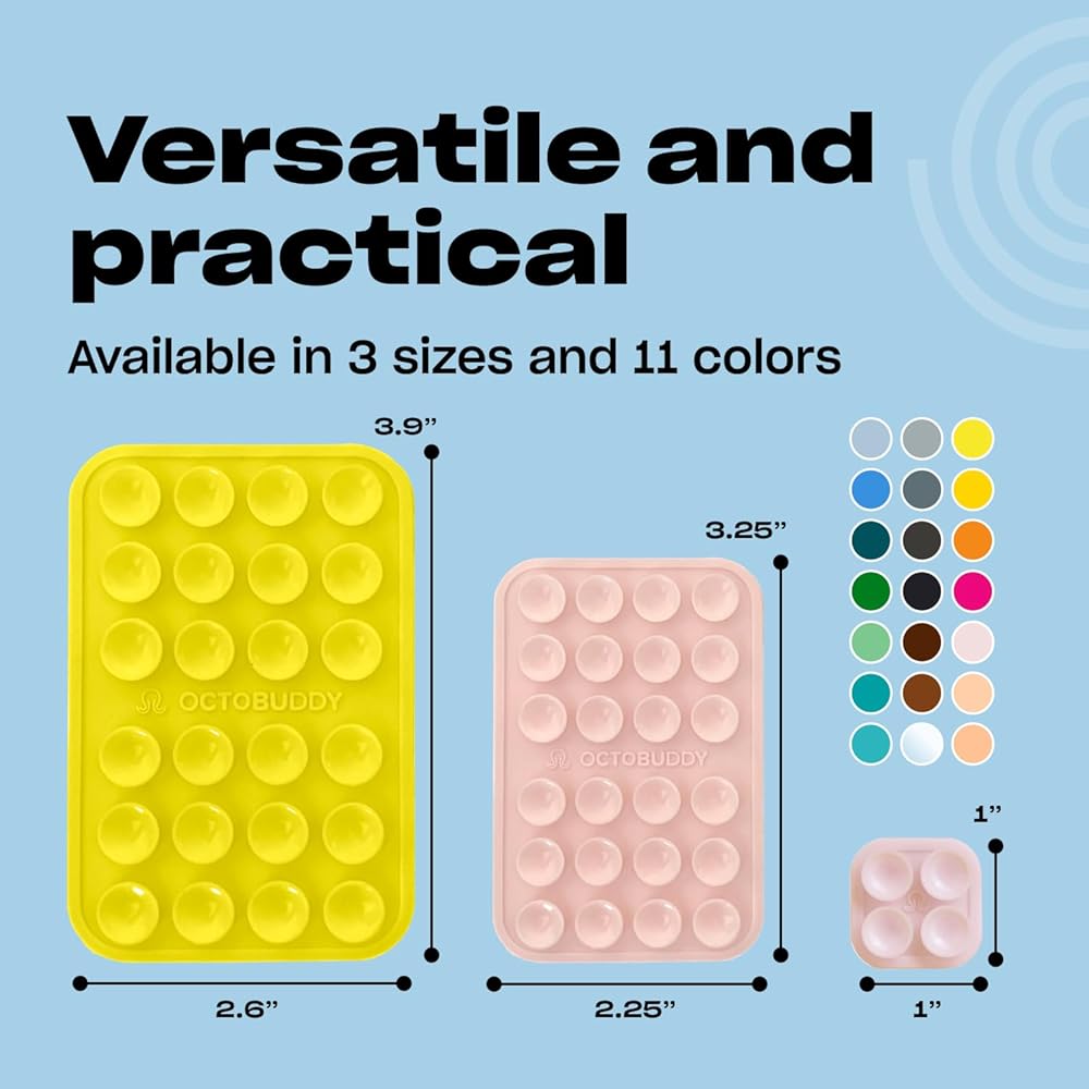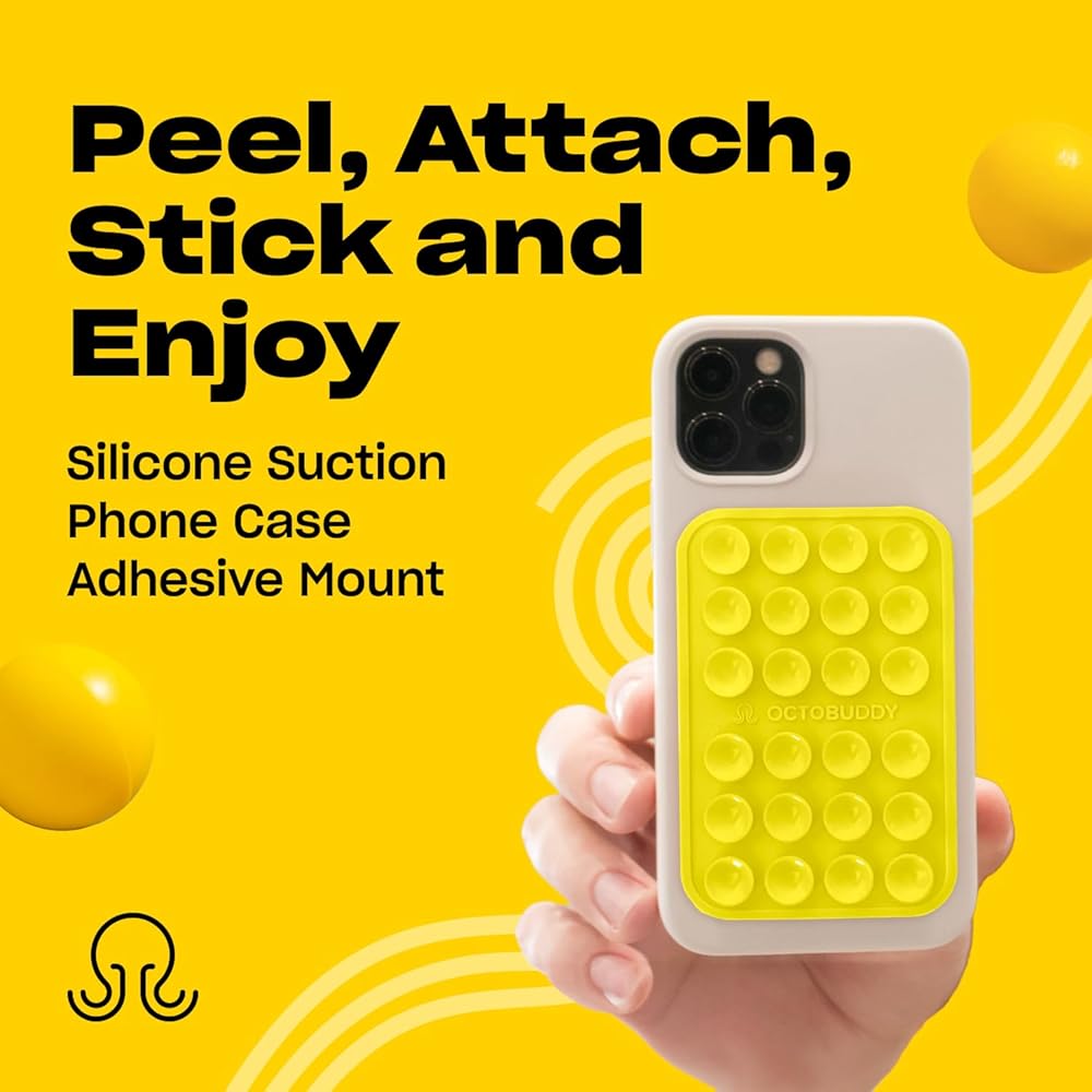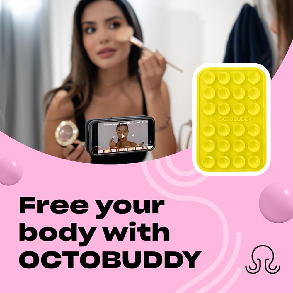 OCTOBUDDY MAX's Silicone Suction Phone Case Adhesive Mount is essential for every influencer and content creator, featuring 24 powerful suction cups for a stable hold on smooth surfaces like car windows, bathroom mirrors, or gym walls. Ideal for hands-free video and selfie shooting on the beach, in bed, on the treadmill and more, its peel-and-stick adhesive back is designed to accommodate larger phones. Expand your creative vision, creating high-quality content for platforms like TikTok, Instagram and YouTube. Available in multiple colors and three different sizes (Regular, MAX, and Mini), this waterproof mount is the must-have tool in your mobile arsenal as you record your adventures in a truck or stream live from your desk. It is the ultimate partner for every creator - men, women and kids alike. INSTRUCTIONS: To use OCTOBUDDY, make sure the mounting surface is flat and clean. It's a big plus if the pad is also clean. Check the pad for damage. Press all sides of the screen so that the suction cups adhere completely. Make sure it's securely in place before releasing. Do not leave the phone unattended for long periods of time. The manufacturer is not responsible for improper use.