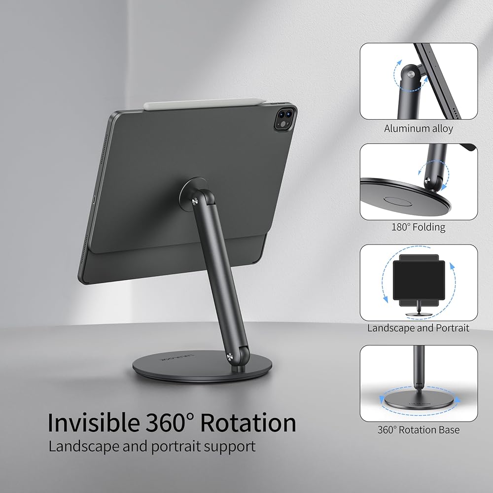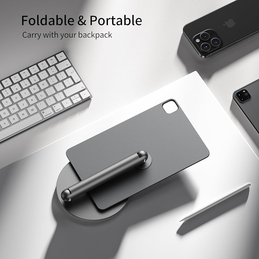• [تصميم محمول قابل للطي] قابل للطي بسهولة لسهولة الحمل. سواء كنت في رحلة عمل أو مسافرًا، فإن هذا الحامل المغناطيسي لمكتب iPad هو مساعدك المثالي، مما يسمح لك بالاستمتاع بتجربة عمل فعالة ومريحة في أي وقت وفي أي مكان.