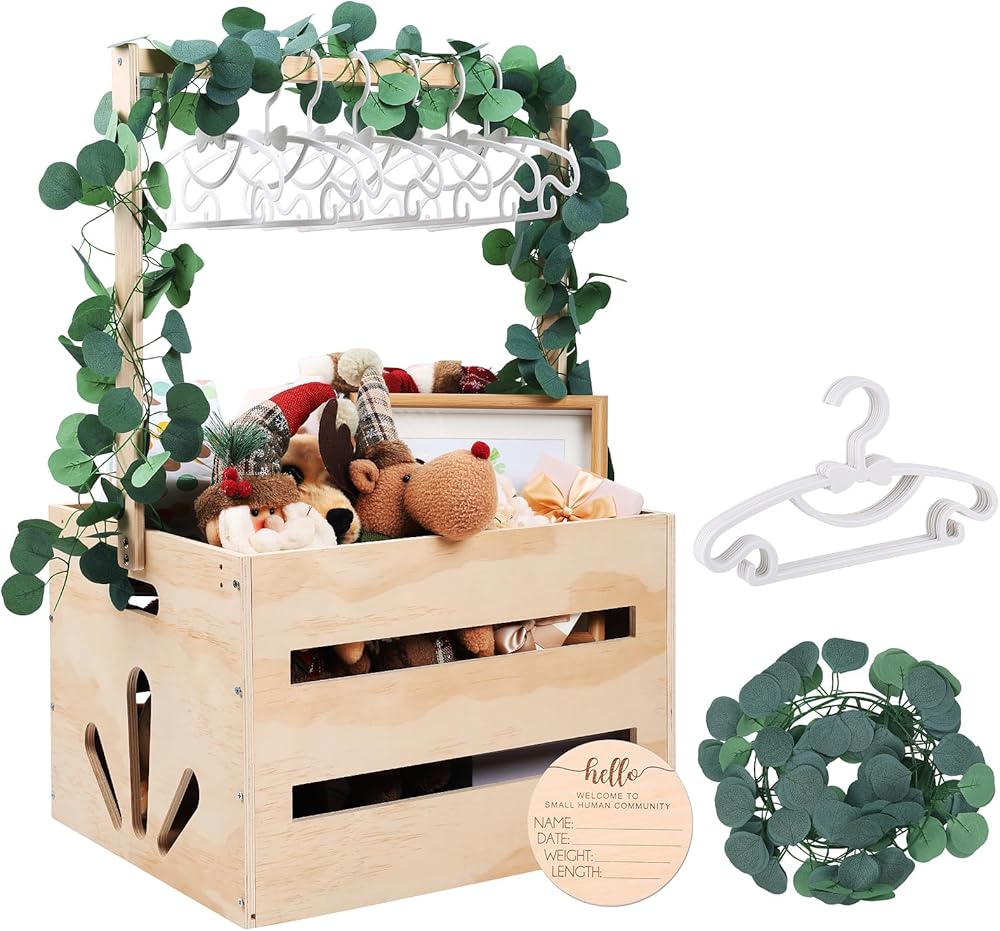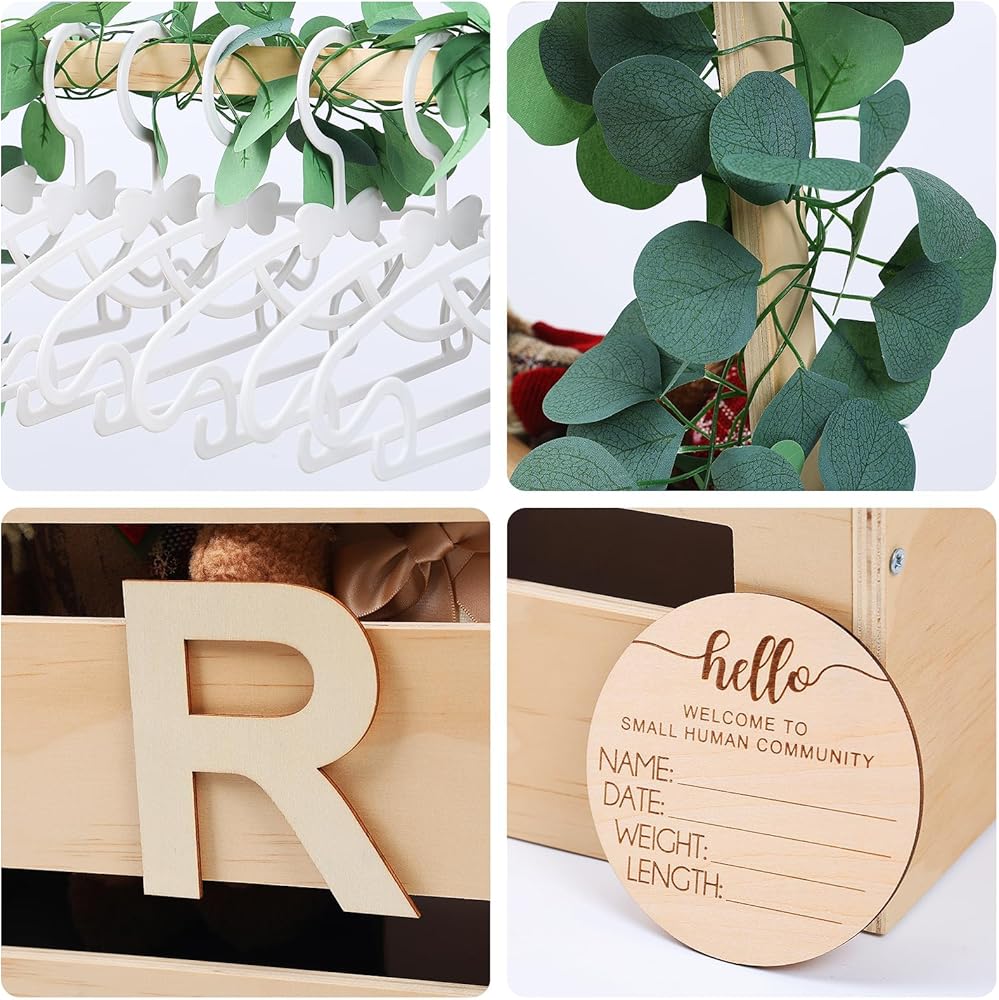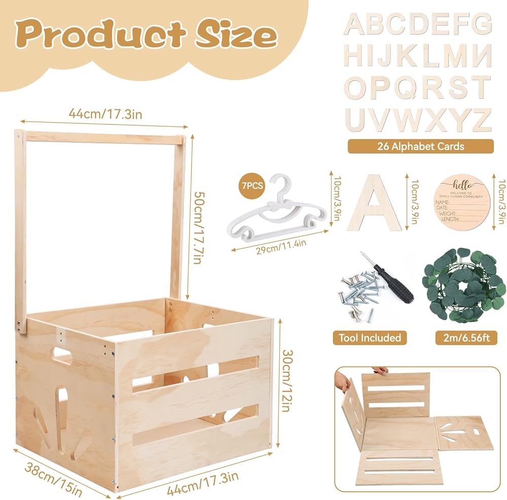 خزانة قفص استحمام خشبي للأطفال، سلة هدايا ترحيب بالطفل مع مقبض، لافتة إعلان الطفل، شماعات أطفال على شكل إكليل حرف كبير، سلة مخصصة للأطفال للوالدين الجدد في الحمل