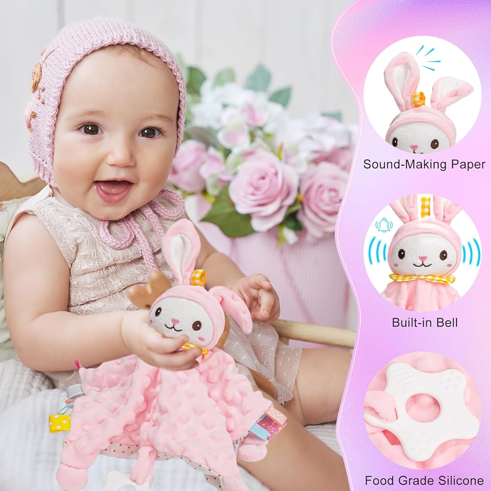 🐰بطانية وخشخشة مسلية🐰- تحتوي بطانية الأرنب هذه على كل شيء حقًا: عضاضة سيليكون على شكل نجمة خماسية، وجرس مدمج في رأس الأرنب، وأذنين مجعدتين، ونسيج قطني ناعم لتشعر به، والكثير من العلامات التي يمكنك استكشافها (على الرغم من ذلك) يجب أن تبقى خارج السرير وبعيدًا عن الأطفال النائمين). تساعد خشخيشة الفطر المحبوكة الطفل على تعلم الإمساك والهز، مما يعزز التنسيق بين اليد والعين. إنها أدوات ممتعة وتفاعلية يمكن للآباء والأطفال الاستمتاع بها معًا.