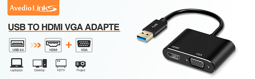 avedio يربط USB بمحول HDMI VGA، ومحول USB 3.0 إلى HDMI محول 1 في 2 خارج يدعم مخرج HDMI VGA Sync 1080p متوافق مع شاشة Windows 7/8/8.1/10 محول محول الفيديو