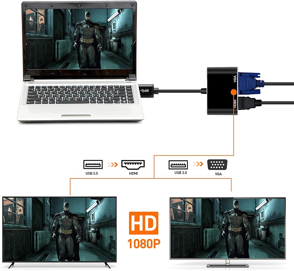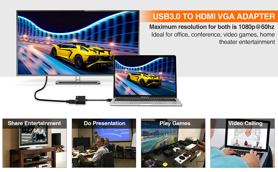 • 【محول USB A 3.0 إلى VGA HDMI】يدعم محول USB إلى HDMI VGA تنفيذ المزامنة وتمديد العرض. يمكنه الاتصال بشاشتين خارجيتين في وقت واحد. يرجى ملاحظة أن الصورة الموجودة على الشاشتين الخارجيتين ستكون هي نفسها.