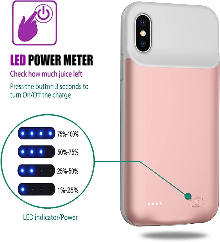 Easy Installation & LED Indicator Lights: Soft top part makes installation easier. Sliding your phone into the case-pushing phone to the bottom Tightly-long pressing back button for 3 seconds. Besides, you can click the back indicator lights for 3 second to check how much power left. (0%-25%-50%-75%-100%)