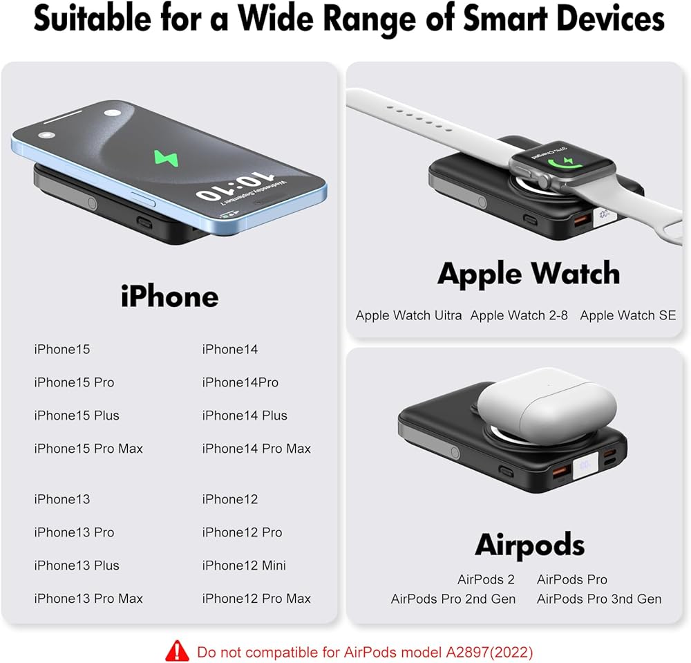 【مناسبة لمجموعة واسعة من الأجهزة الذكية】تم تصميم حزمة البطارية الآمنة هذه بشكل مثالي لهاتف iPhone 15 وiPhone 15 Plus وiPhone 15 Pro وiPhone 15 Pro Max وiPhone 14 وiPhone 14 Plus وiPhone 14 Pro وiPhone 14 Pro ماكس، آيفون 13، آيفون 13 ميني، آيفون 13 برو، آيفون 13 برو ماكس، آيفون 12، آيفون 12 ميني، آيفون 12 برو، وآيفون 12 برو ماكس، سلسلة ساعات أبل (Ultra/8/7/6/SE/5 /4/3/2/1) ،Airpods 2/ Airpods الجيل الثالث/Airpods Pro/Airpods Pro الجيل الثاني فقط. ملحوظة: نوصي بالشحن باستخدام حافظة هاتف Mag-Safe أو بدون حافظات للحصول على شفط كافٍ لتجربة أفضل.