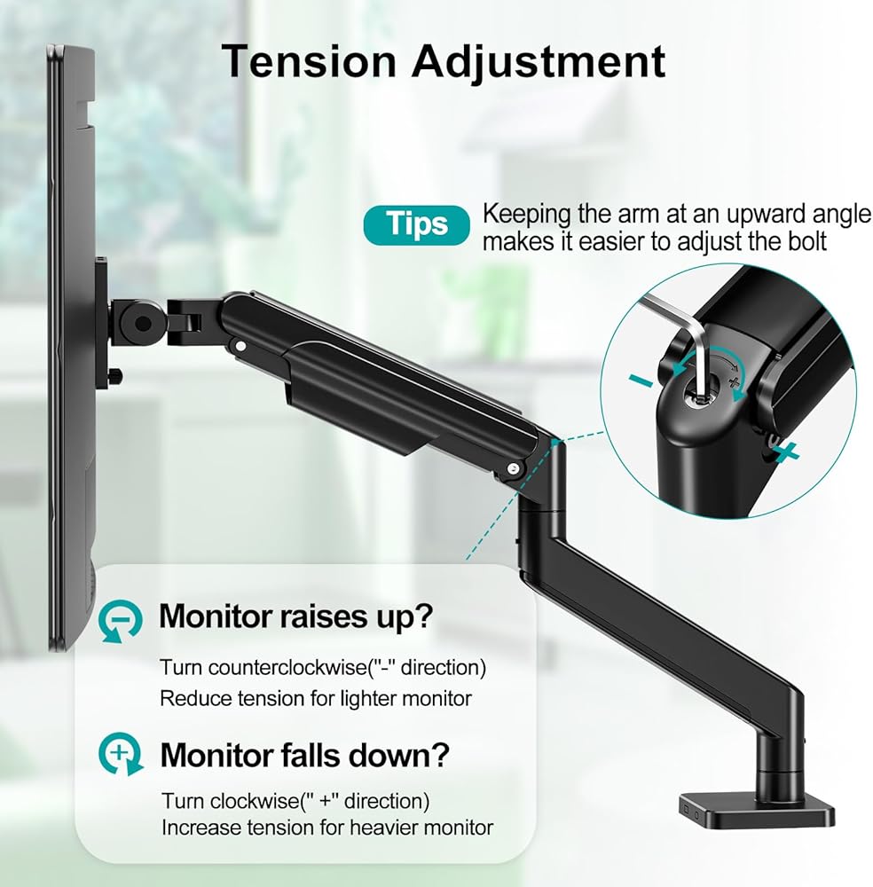 سهلة التركيب - يأتي حامل الشاشة ذو الذراع الواحد فائق العرض مع أجزاء تحمل علامات وتعليمات واضحة. تثبيت بمشبك على شكل حرف C بسمك المكتب 0.39 بوصة - 3.15 بوصة أو اختر التثبيت بحلقة معدنية بسمك المكتب 0.39 بوصة - 2.2 بوصة (قطر الفتحة 0.39 بوصة - 2.36 بوصة). يرجى ضبط الشد وفقًا لوزن الشاشة للعمل بأمان.