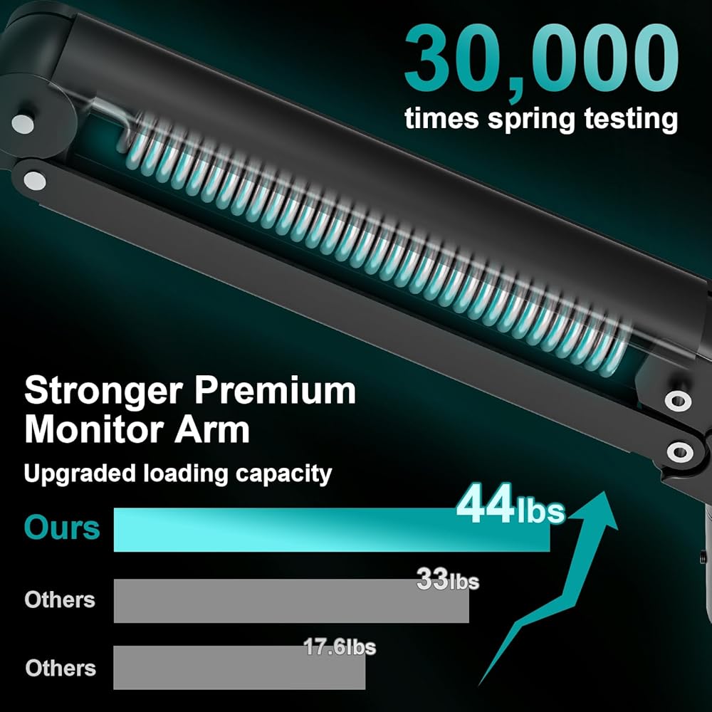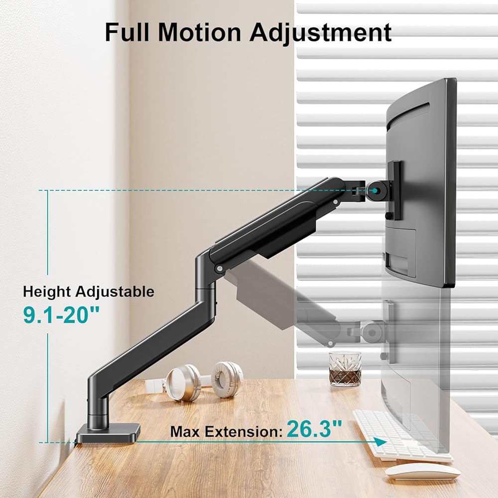 حامل ألعاب هوائي ممتاز - يمكن تمديد ذراع الشاشة المتميز بحد أقصى يصل إلى 26.3 بوصة (يبدأ من حافة المكتب)، وهو أطول من معظم الأذرع المشابهة. نطاق الارتفاع قابل للتعديل من 9.1 بوصة إلى 20 بوصة. يمكن لحامل ذراع الشاشة عالي التحمل الخاص بنا أن يتكيف بسهولة مع أفضل وضع يناسب أسلوب جلوسك أو وقوفك مع توفير مساحة قيمة كبيرة على سطح المكتب.