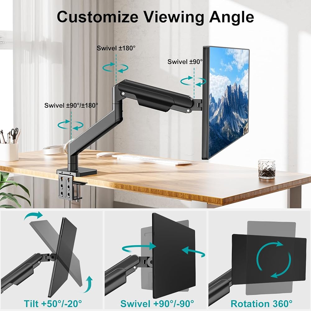ذراع شاشة قابل للتعديل بالكامل - يسمح حامل الشاشة المنحني هذا بإمالة الشاشة لأعلى بمقدار 50 درجة لأسفل -20 درجة، والدوران 180 درجة، والتدوير 360 درجة من الأفقي إلى العمودي. من السهل العثور على زاوية الرؤية المثالية التي تحتاجها، ولن تثني رقبتك لمشاهدة الشاشة، مما يمكن أن يقلل الضغط على رقبتك وكتفك وظهرك، ويزيد من راحتك وتجربة مشاهدة ممتعة.