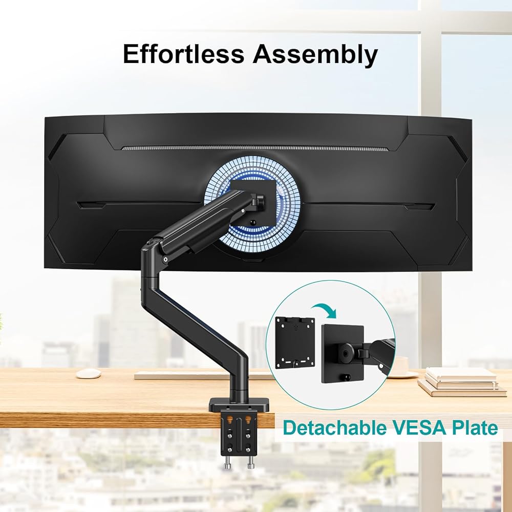 ذراع شاشة واسع للغاية - ذراع شاشة MOUNT PRO عالي التحمل يناسب الشاشات المسطحة أو المنحنية مقاس 17 إلى 49 بوصة التي يصل وزنها إلى 44 رطلاً. تتميز لوحة VESA سريعة التحرير بأبعاد 75 × 75 مم و100 × 100 مم. تم تصميم حامل الشاشة الواحدة للشاشات الأكبر والأثقل، وهو متوافق مع شاشات Samsung Odyssey G9 وLG المنحنية مقاس 49 بوصة.