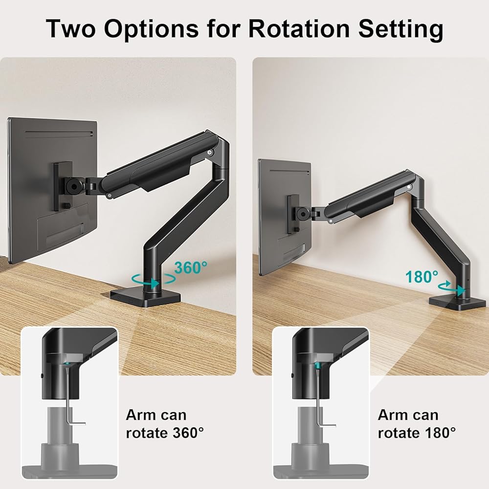 تصميم مبتكر: حامل الشاشة فائق الاتساع هذا مصنوع من الألومنيوم والفولاذ. تساعد لوحة VESA القابلة للفصل وتصميم المفصل سريع التحرير على التثبيت بسهولة. تصميم مبتكر لإيقاف الدوران بزاوية 180 درجة يمنع ذراع الشاشة من التأرجح على الجدران أو الشاشة. إذا كنت تريد أن يدور الذراع السفلي بزاوية 360 درجة، فيمكنك ضبط المسمار الداخلي لإبقائه مجوفًا. تحافظ إدارة الكابلات على الأسلاك بشكل أنيق للحصول على مظهر خالٍ من الفوضى.
