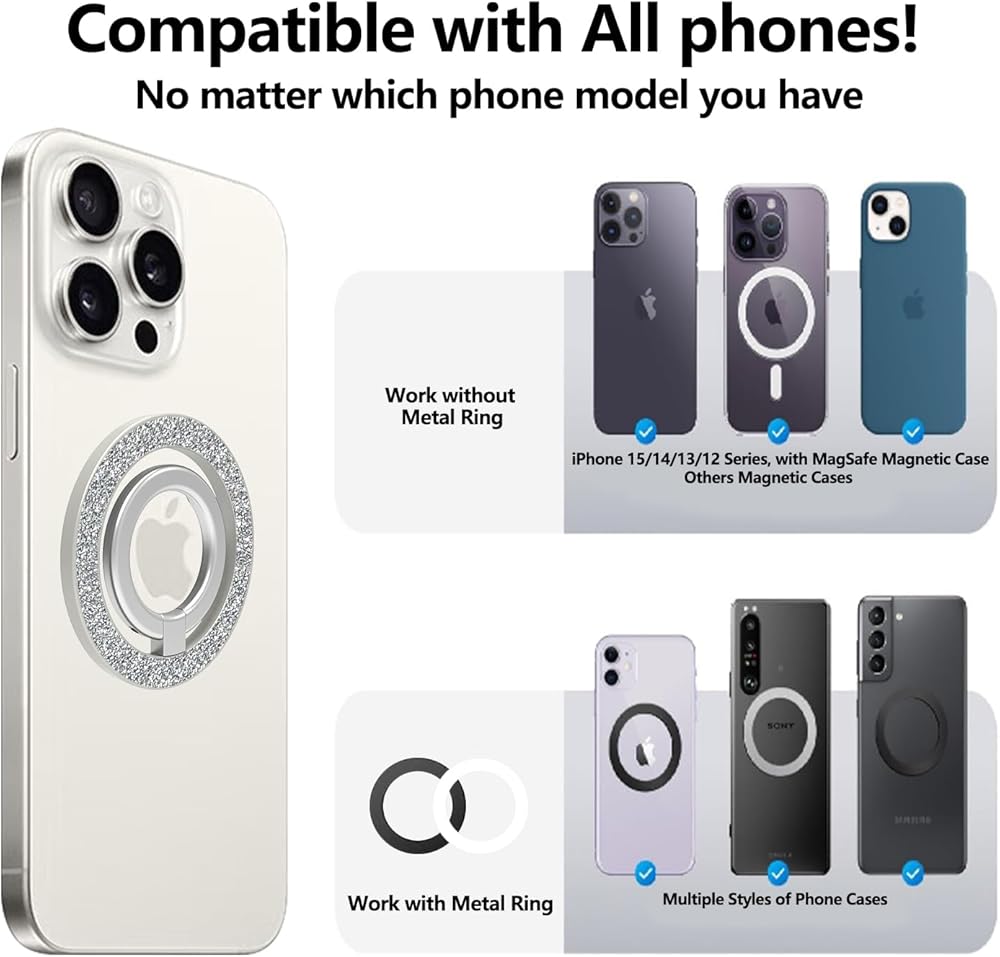 • 【يجلب شعورًا رائعًا】حامل حلقة الهاتف المغناطيسي المعدني بالكامل مطلي بالمكنسة الكهربائية، قوي وسلس، لا يبهت، قبضة أكثر راحة، صديق للأصابع. كما أن الزركونيا المتلألئة تجعلها تتألق مثل خاتم الماس وتبدو أنيقة للغاية.