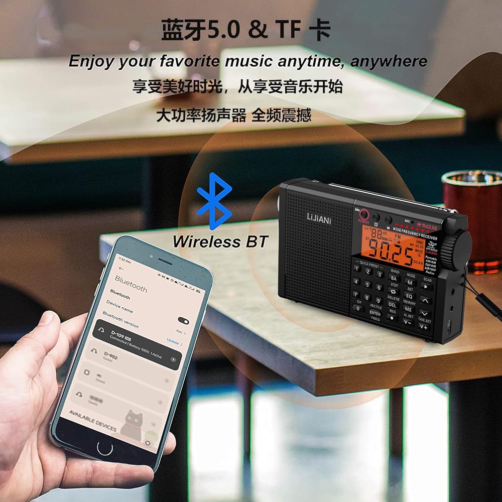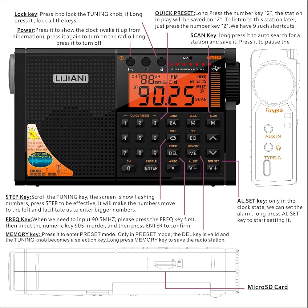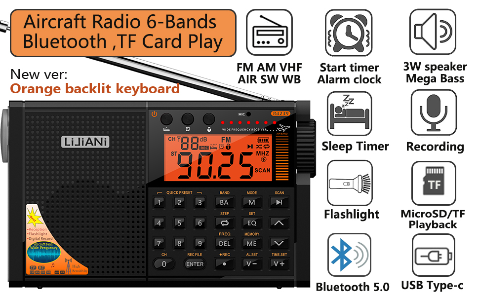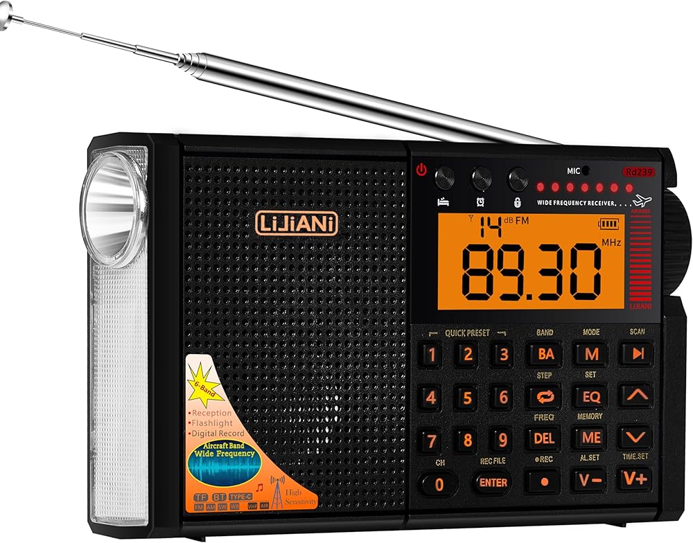 ⚡ميزات غنية: تسجيل رقمي، ساعة منبه، مؤقت نوم، مصباح قراءة، مصباح يدوي قوي، لوحة مفاتيح بإضاءة خلفية، أوضاع EQ، مقبس ANT، يمكنه توسيع الهوائيات الخارجية، يمكنه تسجيل الراديو والصوت المحيط.