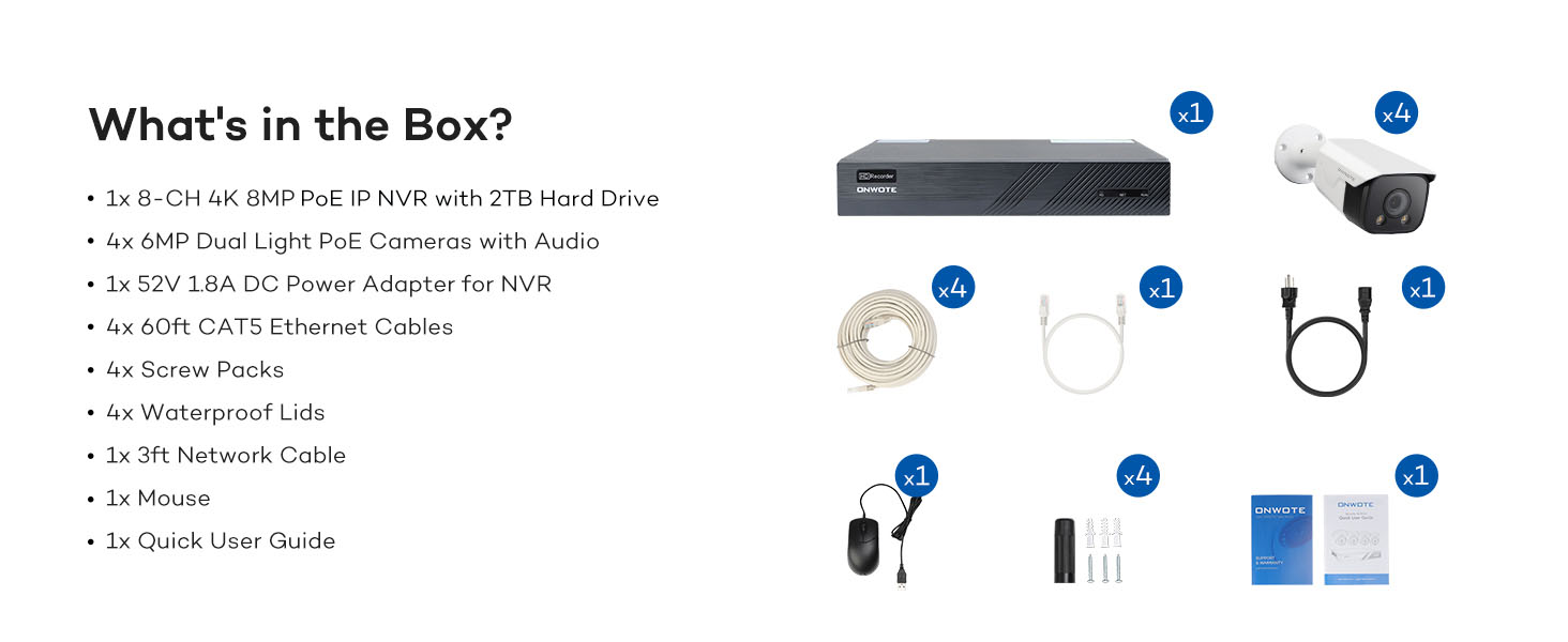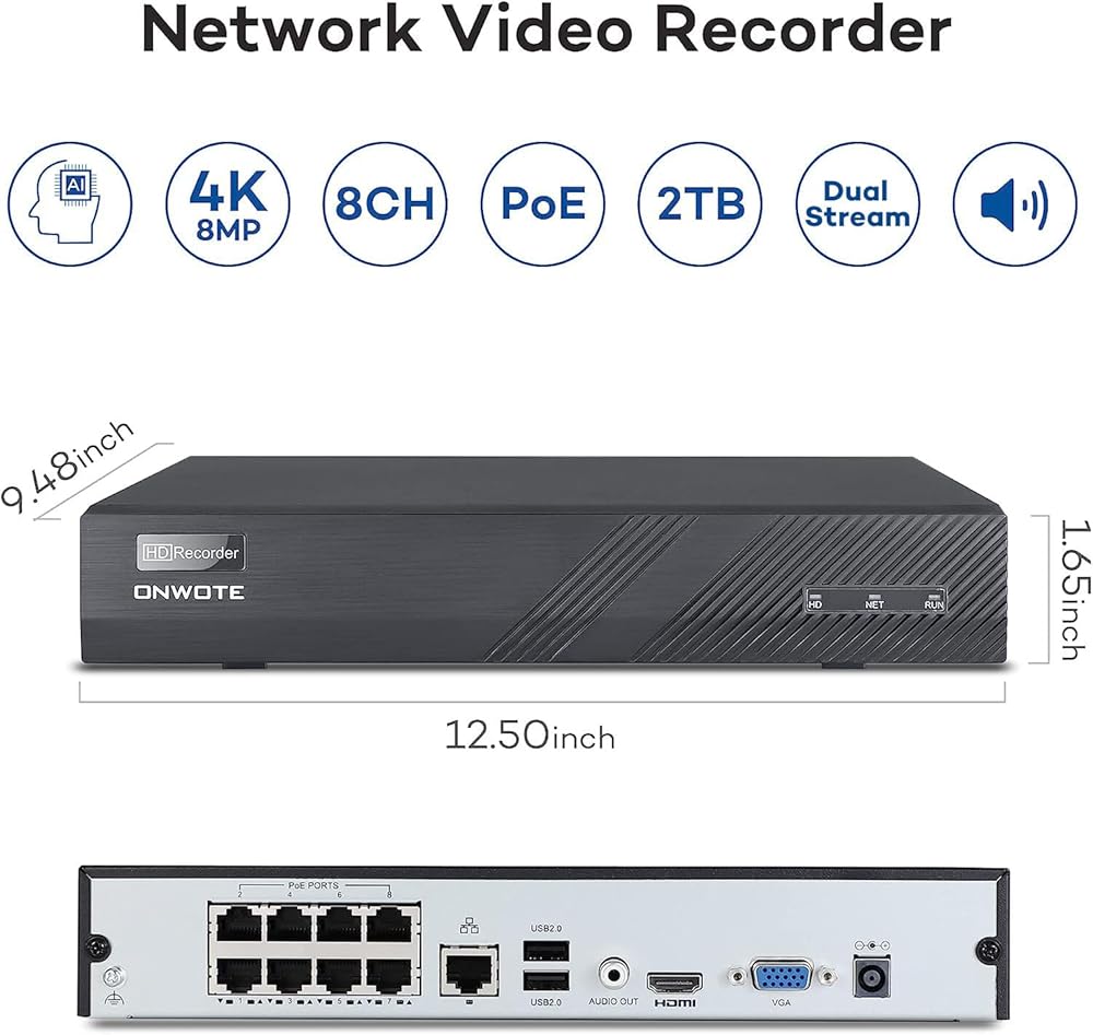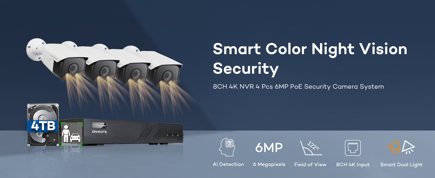 ONWOTE رؤية ليلية ذكية ملونة، نظام كاميرا أمان سلكي 4K NVR PoE، اكتشاف المركبات البشرية بالذكاء الاصطناعي، (4) 6 ميجابكسل 122 درجة زاوية واسعة كاميرات IP خارجية، 8 قنوات 8 ميجابكسل NVR 2 تيرابايت، مراقبة منزلية CCTV