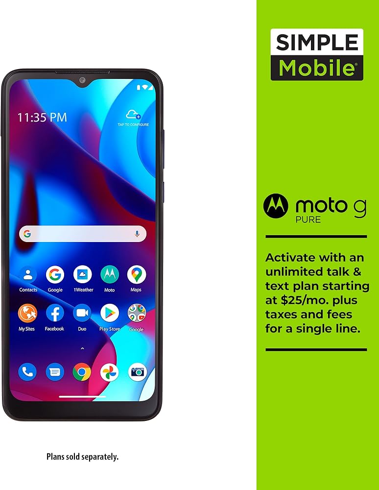 Get a smartphone that does it all with the moto g Pure from SIMPLE Mobile. Equipped with an octa-core processor with HyperEngine, the moto g Pure is notable for its super-responsive performance that reacts instantly to every touch, tap, and swipe. This, paired with its ultra-wide Max vision HD+ display, make it the perfect smartphone for playing games, streaming movies, video chatting and more. Made with accidents in mind, the moto g Pure is water-repellent so you can worry less about splashes, spills and light rain. Capture stunning portraits with the 13MP Dual Camera System – regardless of the time of day – with its Night Vision feature. Plus, keep the fun going all weekend long with two-day battery.
