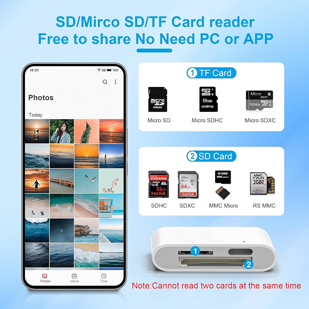 محول بطاقة SD/Mirco SD: يتوافق محول iphone هذا مع 6 أنواع مختلفة من بطاقات الذاكرة: SD/SDHC/SDXC/Micro SD/Micro SDHC/Micro SDXC، ويدعم بطاقات ذاكرة تصل إلى 2 تيرابايت. (ملاحظة: لا يمكن لمحول الكاميرا الخاص بنا إلى iPhone قراءة بطاقة SD وبطاقة Micro SD في نفس الوقت)