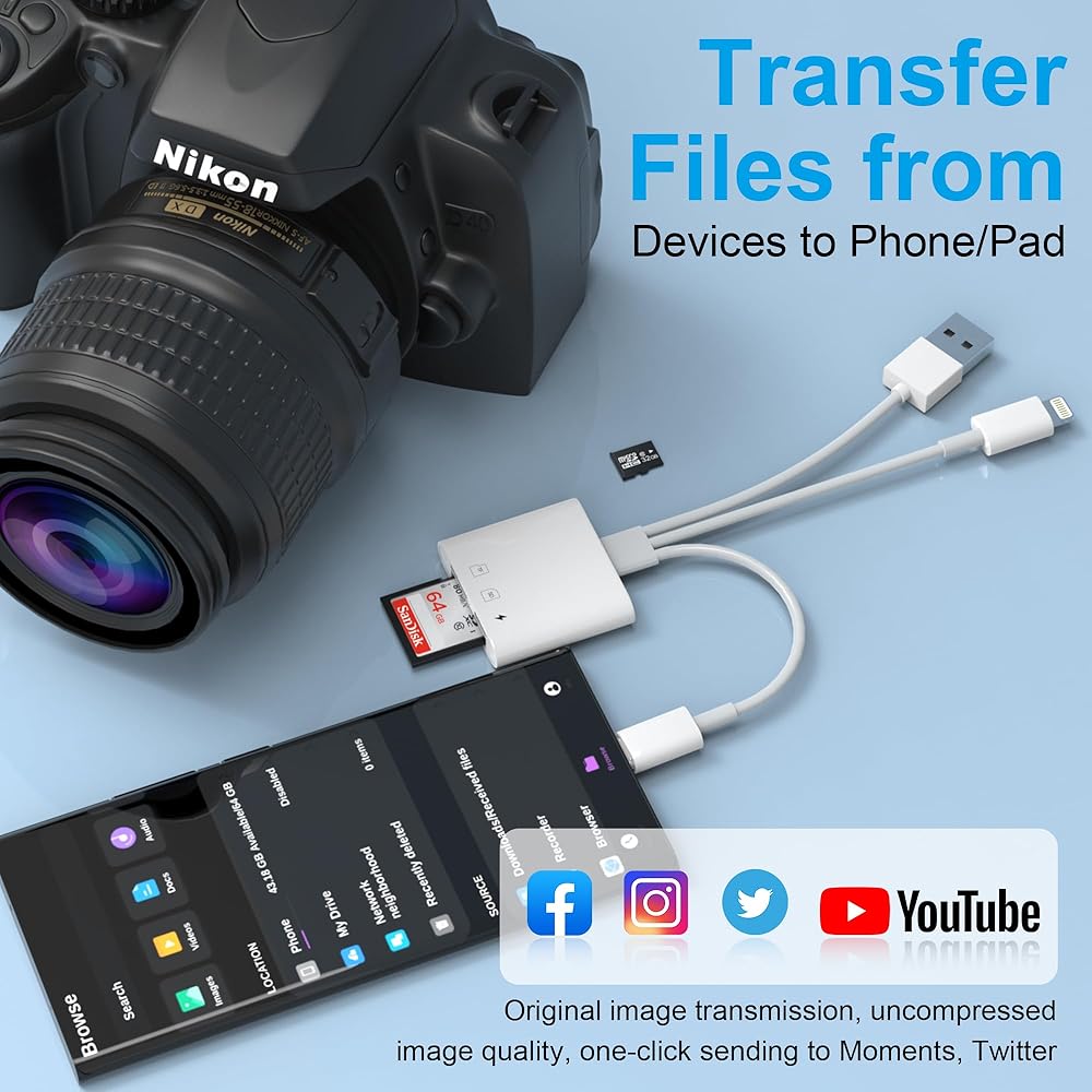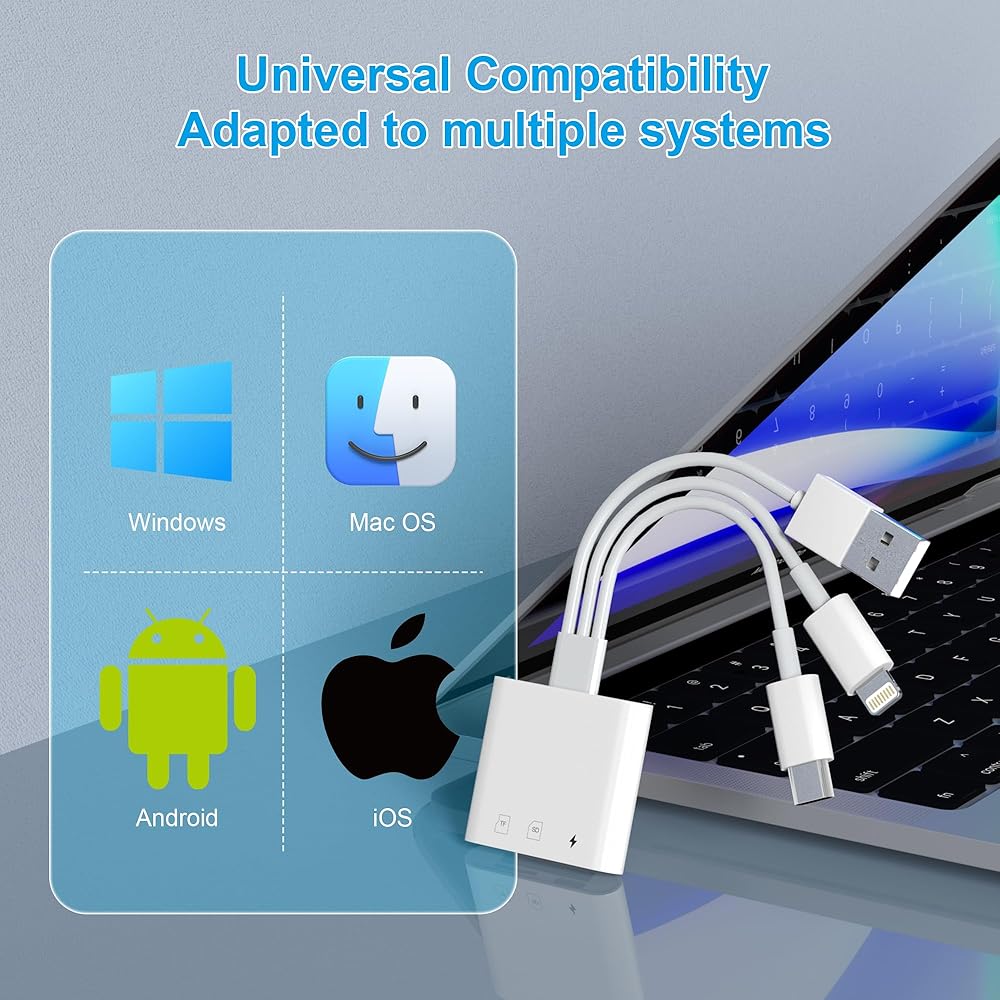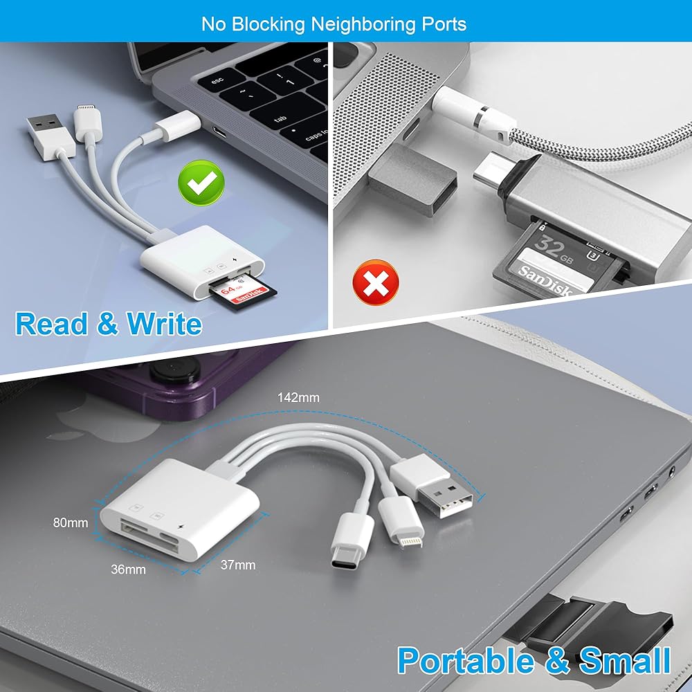 مصمم لأجهزة Apple/Android/USB A: يتضمن قارئ بطاقة SD هذا لجهاز iPhone كلا من منافذ Lightning/USB-C/USB A. يدعم قارئ بطاقات SD/Micro SD جميع أجهزة iPhone التي تعمل بنظام iOS 12.0 وما فوق، وأجهزة iPad التي تعمل بنظام iOS 12.0 أو أحدث، وهواتف OTG Android وأجهزة الكمبيوتر والأجهزة الأخرى ذات منافذ Type-C/USB-C. كما أنه يدعم جميع الأجهزة التي تحتوي على منافذ USB A، بما في ذلك Samsung Galaxy وGoogle Pixel. متوافق مع كاميرات داش وكاميرات المسار وبطاقات ذاكرة الكاميرا الرقمية بجميع أنواعها.