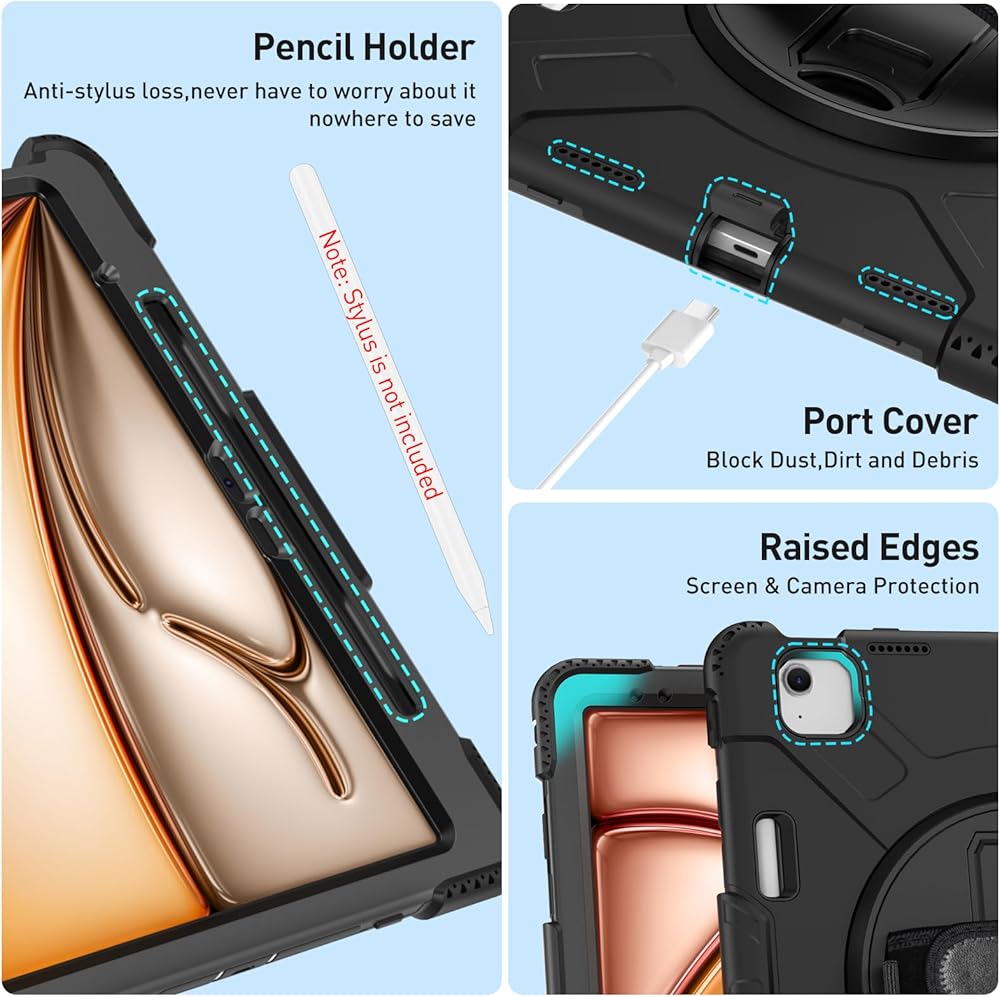 [مسند وحامل قلم رصاص] يدعم حافظة iPad Air 13 بوصة مع حامل مدمج قابل للدوران وقابل للطي يوفر زوايا قابلة للتعديل للحصول على رؤية مثالية. يوفر الحامل القوي الدعم للكتابة ومشاهدة الأفلام وغير ذلك الكثير، مما يضمن تجربة مستخدم مريحة. بالإضافة إلى ذلك، تتميز هذه الحافظة بفتحة قلم Apple للتخزين الآمن، وتمنع قلم Apple من التحرك مما يمنع العثور عليه والتسبب في فقدانه.
