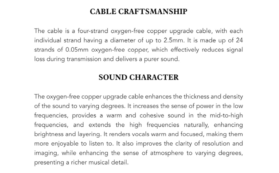 【خصائص الصوت】: يعمل كابل ترقية النحاس الخالي من الأكسجين على تحسين سمك وكثافة الصوت بدرجات متفاوتة. يزيد من الإحساس بالقوة في الترددات المنخفضة، ويوفر صوتًا دافئًا ومتماسكًا في الترددات المتوسطة إلى العالية، ويمتد الترددات العالية بشكل طبيعي، مما يعزز السطوع والطبقات. فهو يجعل الأغاني دافئة ومركزة، مما يجعلها أكثر متعة للاستماع إليها وتقديم تفاصيل موسيقية أكثر ثراءً.