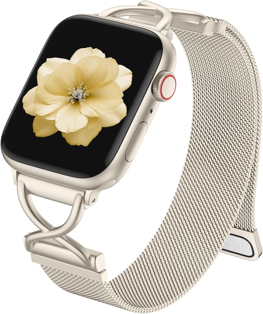 【مادة معدنية فاخرة】مصنوع من الفولاذ المقاوم للصدأ الفاخر، يتميز سوار iWatch المغناطيسي للنساء ببنية عالية الجودة ومقاومة للتآكل مع سطح غير قابل للانزلاق. يضمن تصميمها الشبكي المبتكر، إلى جانب تقنية التلميع الفريدة، ملاءمة سلسة وجيدة التهوية، مما يضمن الراحة طوال اليوم