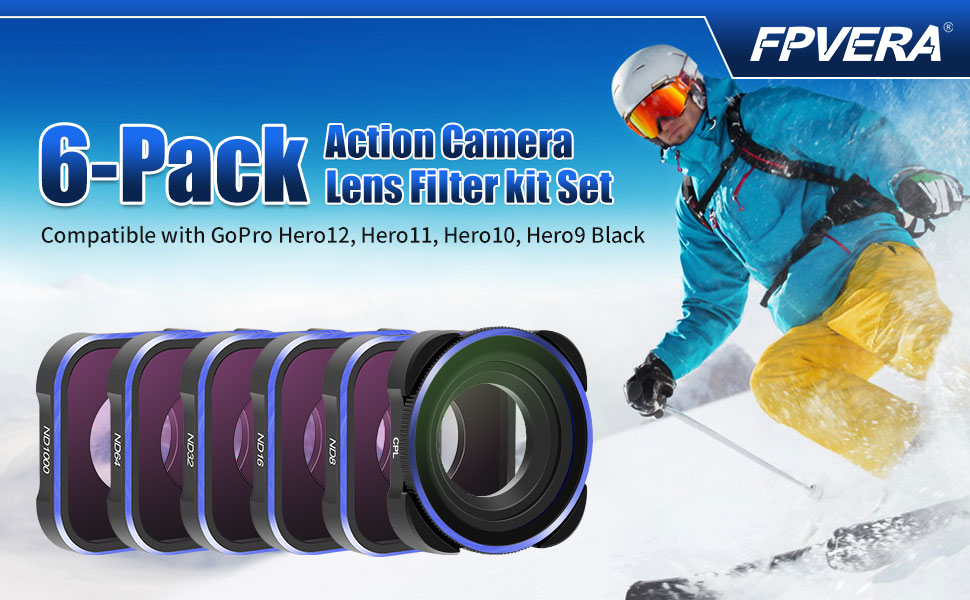 مجموعة مرشح FPVERA ND لـ GoPro Hero 12 11 10 9 أسود، 6 عبوات CPL ND8، ND16، ND32، ND64، ND1000 مجموعة مرشح عدسات الكاميرا المستقطبة مع إطار من سبائك الألومنيوم وزجاج بصري HD AGC مطلي بـ 18 طبقة