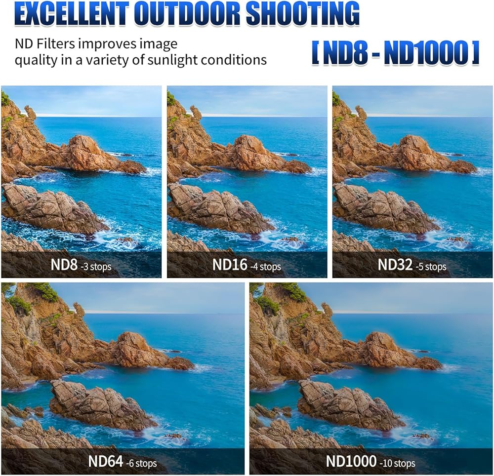 مرشحات ND: عند التقاط الصور، يمكنها تعزيز تشبع اللون ومنع التعرض المفرط وتعزيز وضوح الصورة في بيئات الإضاءة القوية المختلفة. عند تصوير الفيديو، يمكنك تقليل سرعة الغالق لتحسين راحة الصورة