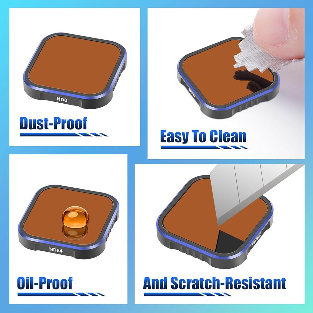 تطبيق متعدد المشاهد: إطار مجموعة الفلتر مصنوع من سبائك الألومنيوم وتصميم غير قابل للانزلاق، سهل التركيب والإزالة. يمكن أن تساعد المرشحات في الحصول على صور ومقاطع فيديو مستقرة وواضحة أثناء ممارسة الألعاب الرياضية مثل الجري والمشي لمسافات طويلة والتزلج وركوب الدراجات والقفز بالمظلات.
