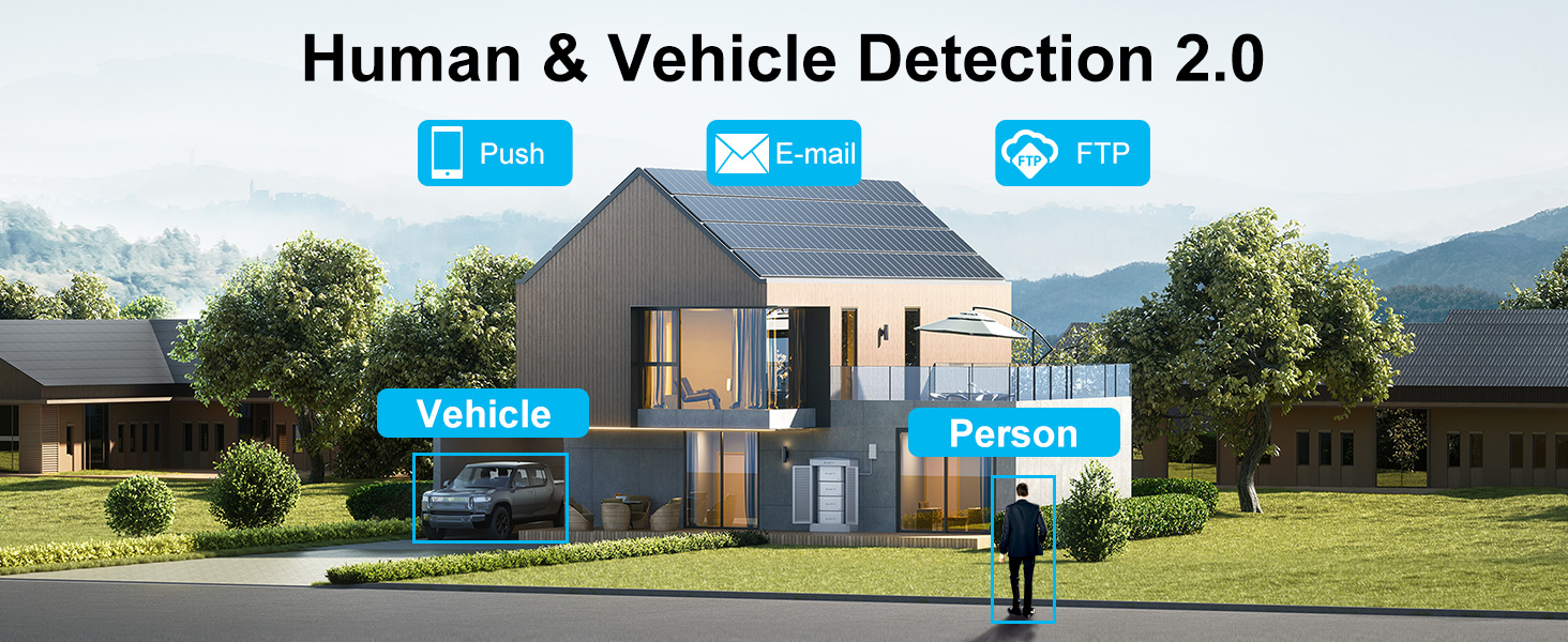 【الكشف عن الإنسان/المركبة والتنبيهات الذكية】مع نظام كاميرا الأمان Anpviz المدعوم بتقنية الذكاء الاصطناعي الذكية، ونظام كشف الذكاء الاصطناعي الذي يحدد بدقة الأشخاص والمركبات وينبهك، سوف تتلقى تنبيهات الحركة لنوع الكشف المحدد وتظل على اطلاع مجرد إلقاء نظرة على هاتفك.