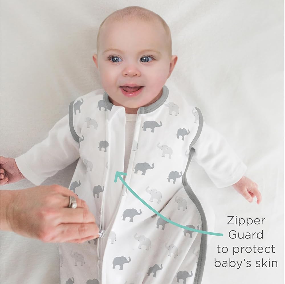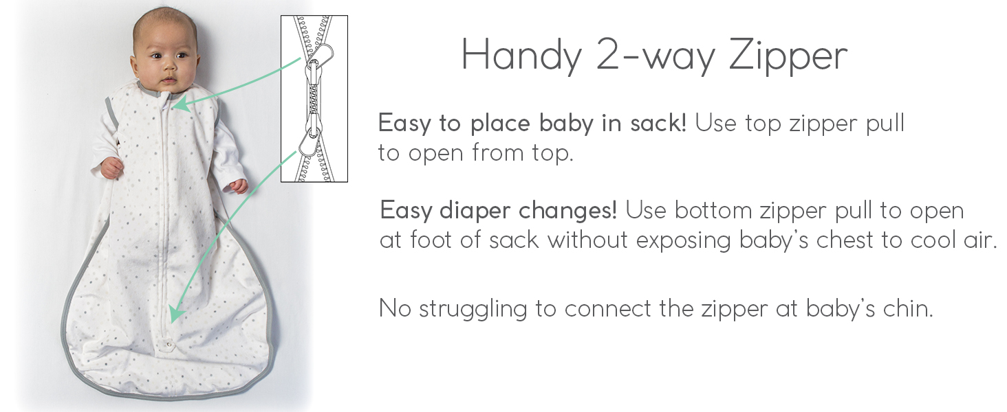 Handy 2-way zipper that unzips from bottom for easy diaper changes; Unzips from the top makes it easy to place baby in sack; plus zipper guard to protect baby's skin