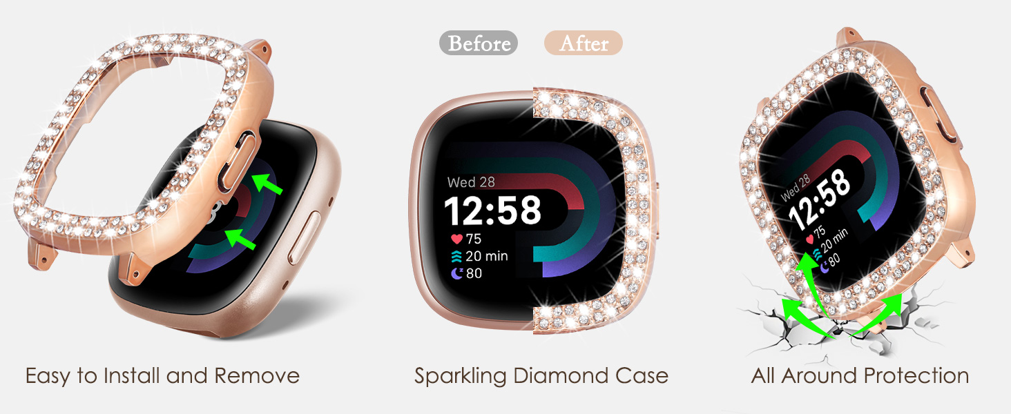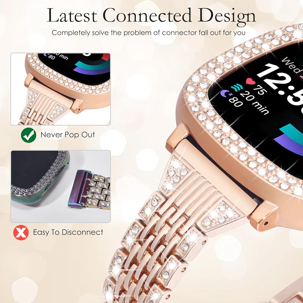 ✿ 【خامة ممتازة】أحزمة MOFREE Slim Fitbit Versa 4 للنساء مصنوعة من معدن عالي الجودة وأحجار الراين اللامعة، مصقولة جيدًا، تصميم بدون حواف حادة، مقاوم للماء/العرق، متين ولا يصدأ، مريح في الارتداء. يحمي الغطاء الواقي الصلب اللامع ساعتك من الخدوش والصدمات والسقوط العرضي (لا يشمل غطاء الشاشة)