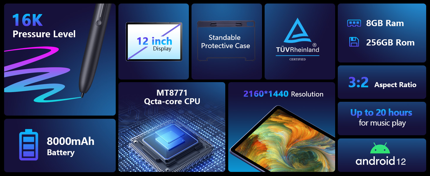 مساحة تخزين وذاكرة كبيرة: يأتي تابلت الرسم المستقل XP-Pen Magic مقاس 12.2 بوصة مزودًا بذاكرة تشغيل بسعة 8 جيجابايت وذاكرة تخزين بسعة 256 جيجابايت، مما يوفر مساحة كافية لتخزين جميع أعمالك الفنية والمواد المرجعية والموارد الإبداعية.