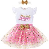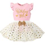 Toddler birthday outfit design: The birthday princess outfit is Cotton princess birthday outfit. The birthday girl toddler shirt is Pink sleeveless / pink short sleeve / pink long sleeve / white sleeveless / white long sleeve / black sleeveless / black long sleeve printed with glittery letters 'Birthday Princess' and crown pattern. Short birthday girl tshirt is 2 layers of fabric design for the birthday princess outfit, the toddler birthday dresses has gold dot bubble sequins.