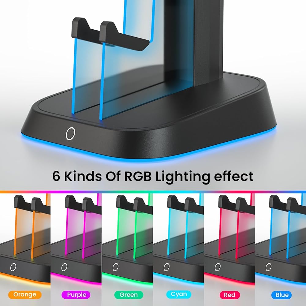 • 🌈[6 أوضاع إضاءة رائعة وتحكم بزر واحد] يوفر حامل سماعات الألعاب الجديد 6 أوضاع لتأثير الإضاءة، ويحتوي على 6 أوضاع إضاءة ملونة: الأحمر والأخضر والأزرق والأرجواني والسماوي والبرتقالي، مما يخلق جوًا رائعًا للألعاب. بالضغط على الزر لتغيير وضع اللون، يمكنك اختيار أوضاع الإضاءة في مشاهد مختلفة.