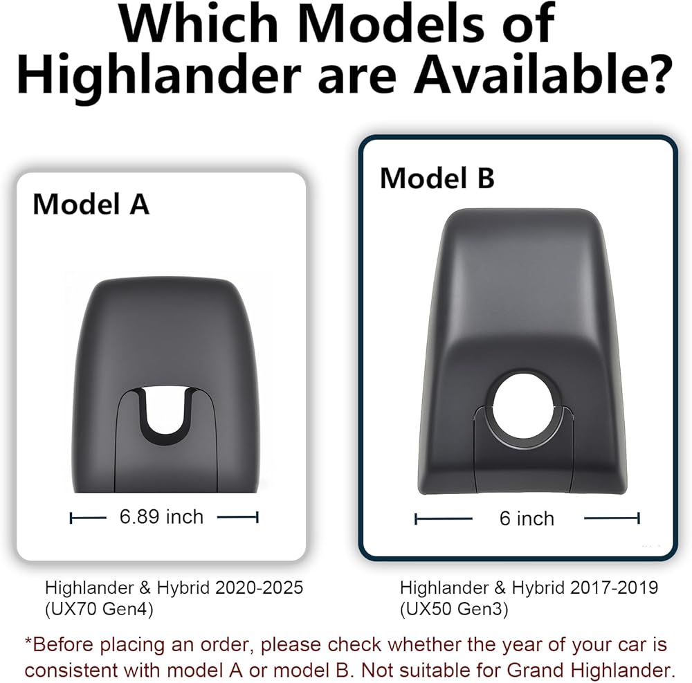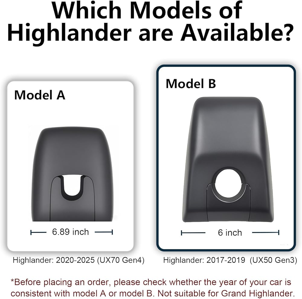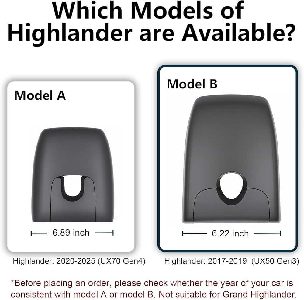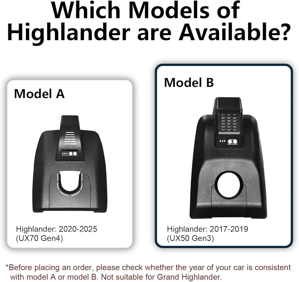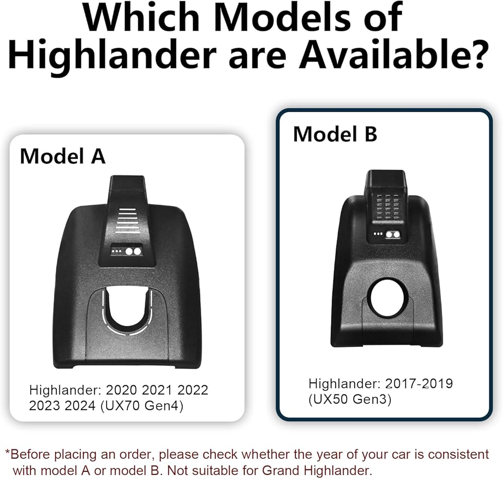 يرجى مراجعة الصورة الثانية بعناية للمساعدة في اختيار الطراز الصحيح. الموديل A مناسب لـ Highlander & Hybrid 2020 2021 2022 2023 2024(UX70 Gen4)، الطراز B مناسب لـ Highlander & Hybrid 2017 2018 2019 (UX50 Gen3). إذا كنت لا تزال غير متأكد من الطراز المناسب لنمط سيارتك، فيرجى التقاط صورة لغطاء مستشعر السيارة الأصلي الخاص بك وإرسالها إلينا، وسنقوم بتأكيدها لك.