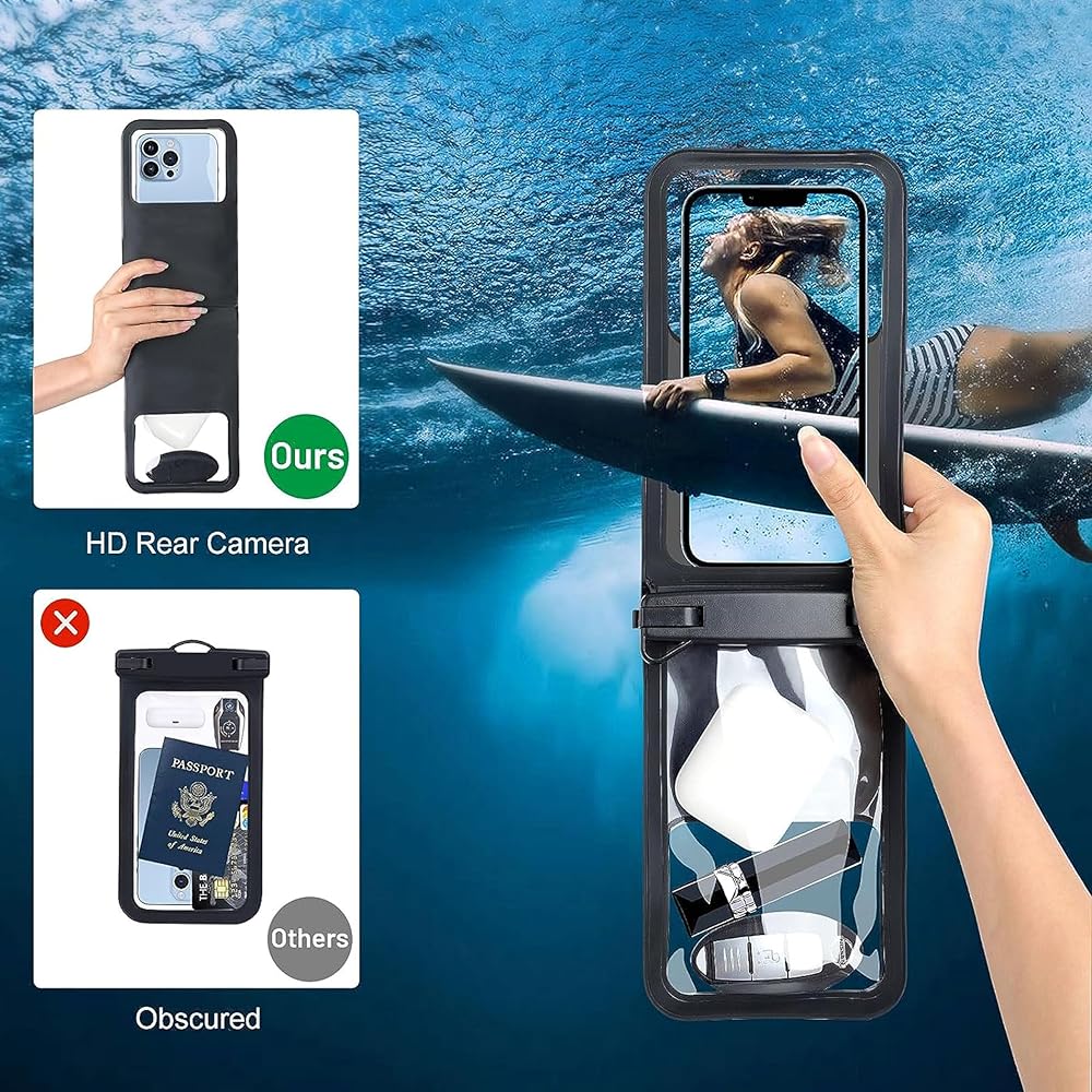 • مادة PVC - نوافذ وجوانب الحقيبة المقاومة للماء للهواتف المحمولة مصنوعة من مادة PVC الناعمة وعالية الجودة. إنها حساسة للغاية وملموسة. التقط صورًا ومقاطع فيديو عالية الجودة تحت الماء من خلال نافذتنا الشفافة المصممة خصيصًا. (ملاحظة: يمكنك فقط استخدام زر الصوت للتصوير تحت الماء.)