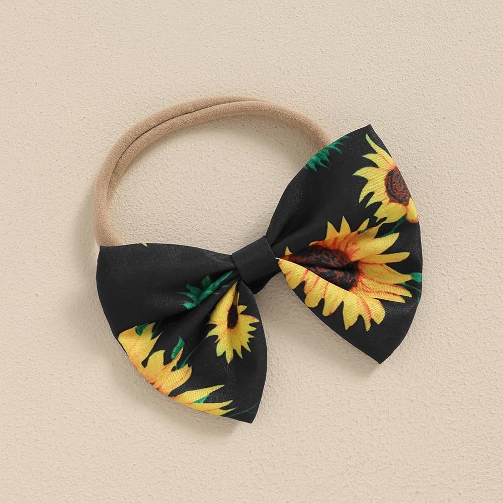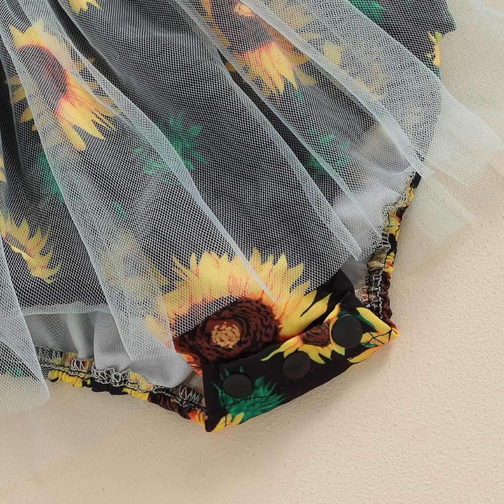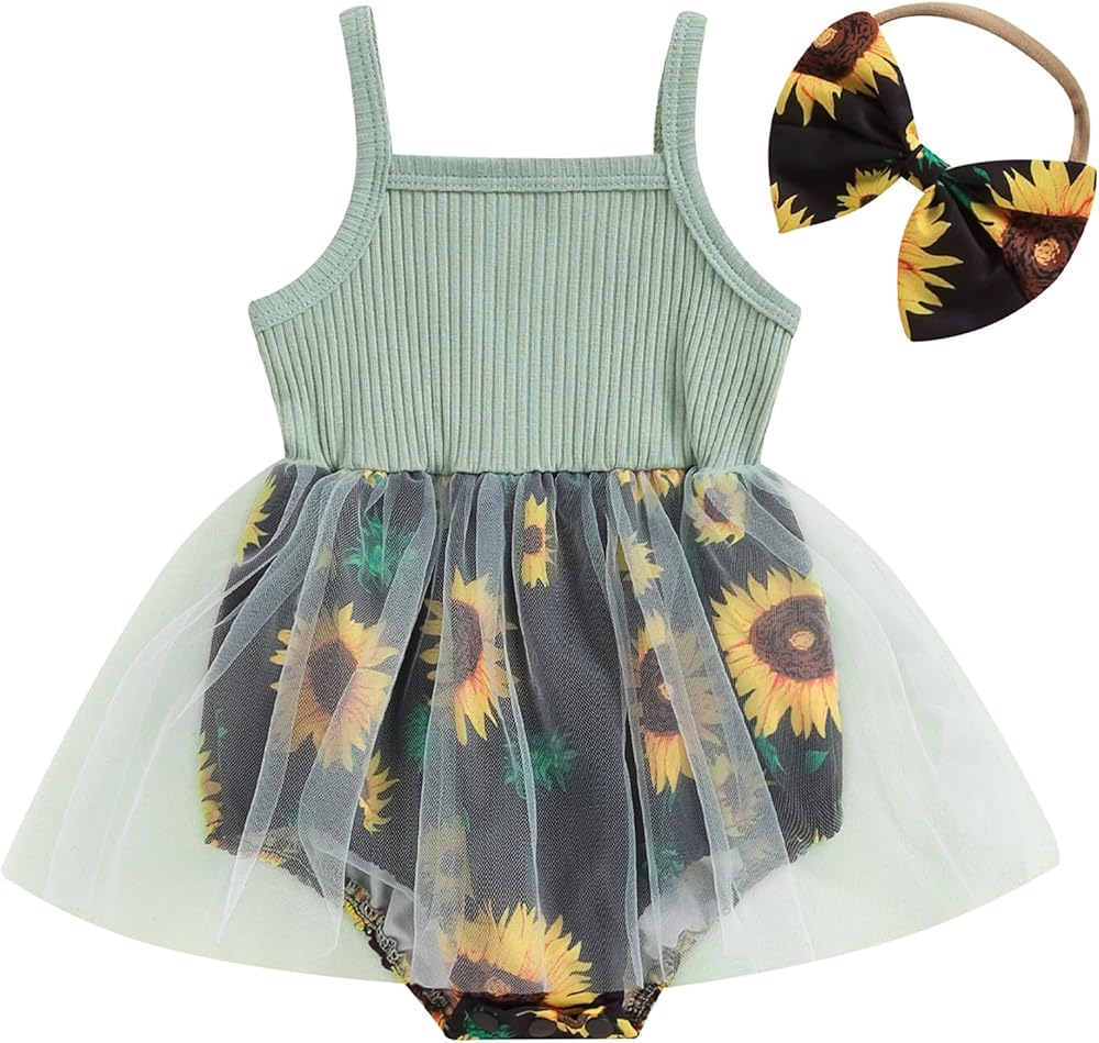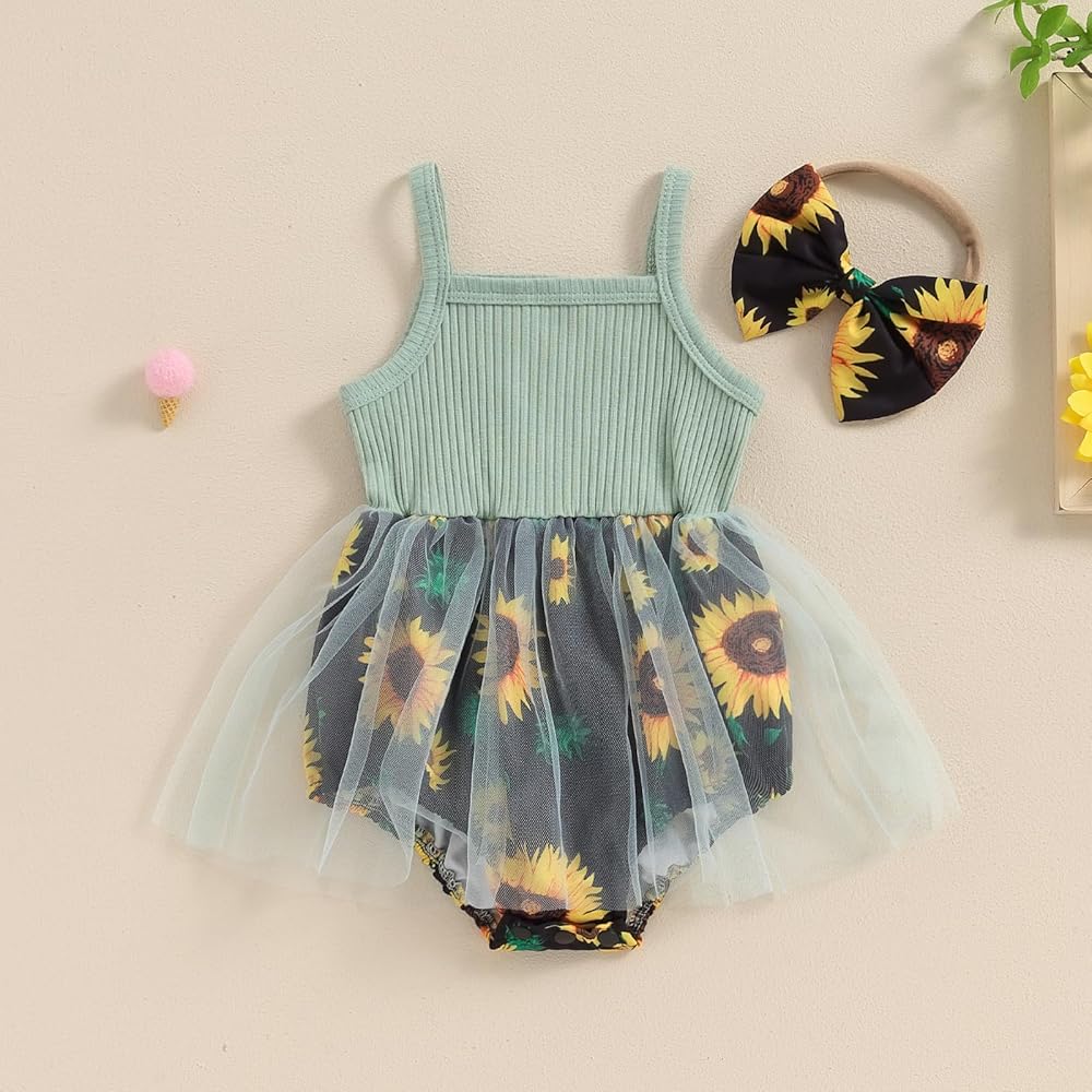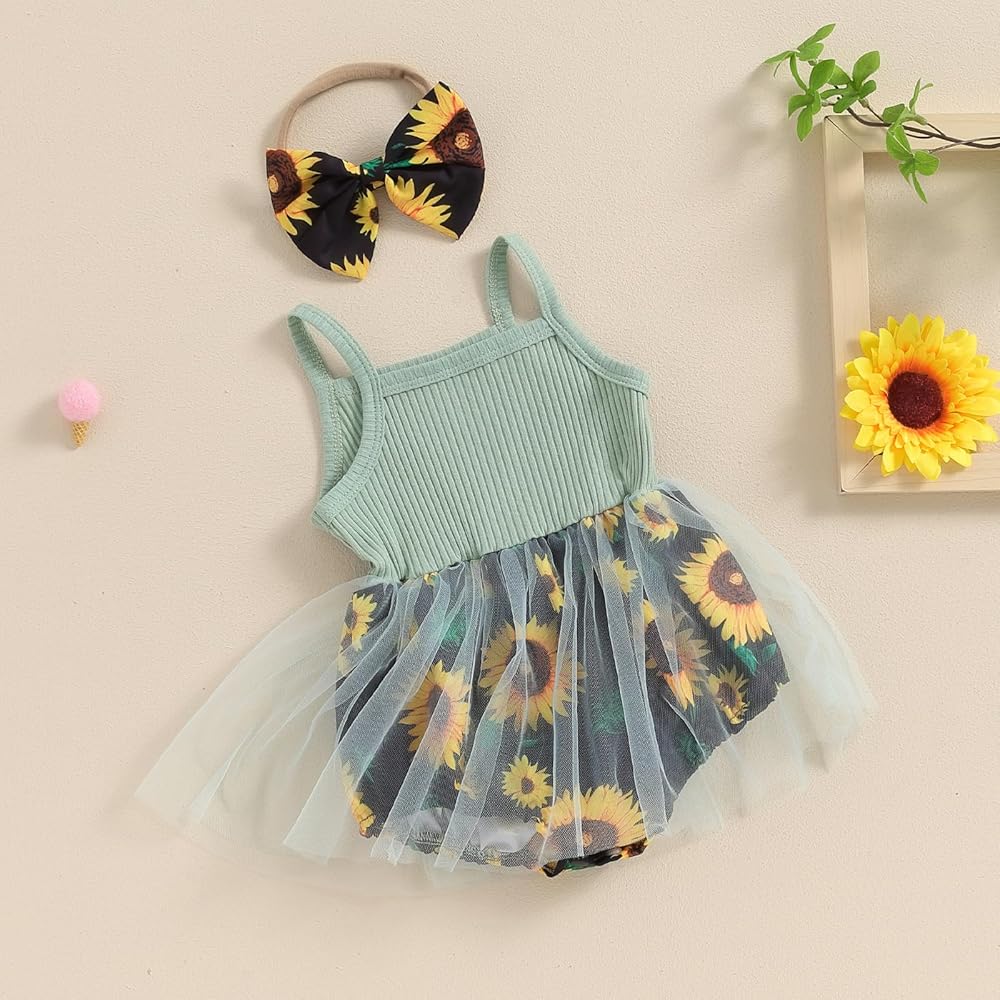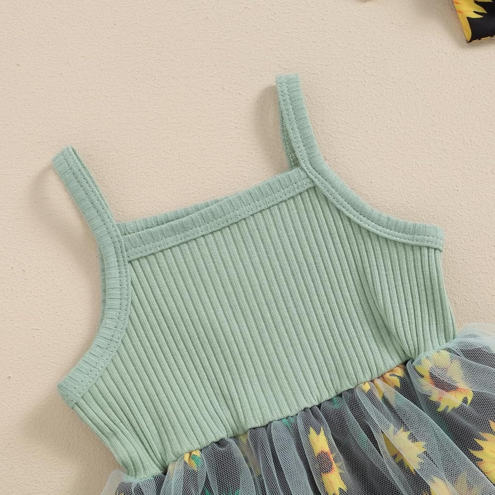 طباعة عباد الشمس اللطيفة، ثوب فضفاض مضلع بدون أكمام وتنورة تول توتو من قطعة واحدة مع عصابة رأس من قطعتين، مجموعة ملابس أميرات الصيف للفتيات حديثي الولادة