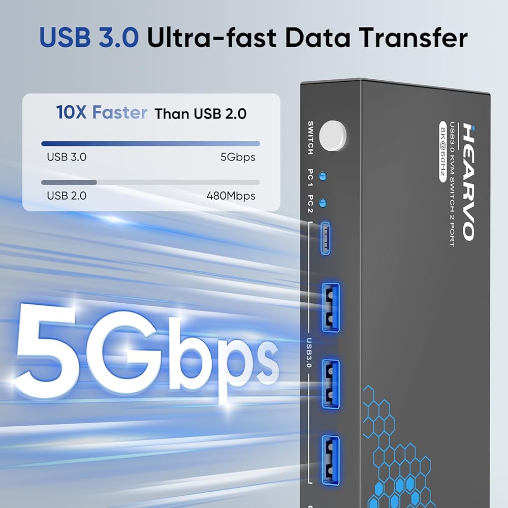 【ثلاثة منافذ USB 3.0】تتميز مفاتيح KVM بـ 3 منافذ USB 3.0 لسرعات نقل بيانات فائقة السرعة تصل إلى 5 جيجابت في الثانية. فهو يسمح لك بمشاركة الأجهزة الطرفية مثل الطابعات ومحركات الأقراص الخارجية بسلاسة بين جهازي كمبيوتر، مما يقلل الفوضى ويعزز الكفاءة. مثالي لمشاركة أجهزة USB مثل لوحات المفاتيح والفأرة والماسحات الضوئية والطابعات ومحركات الأقراص المحمولة، حيث يكتشف هذا المفتاح الأجهزة المتصلة ويطابقها تلقائيًا.